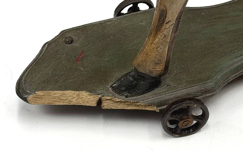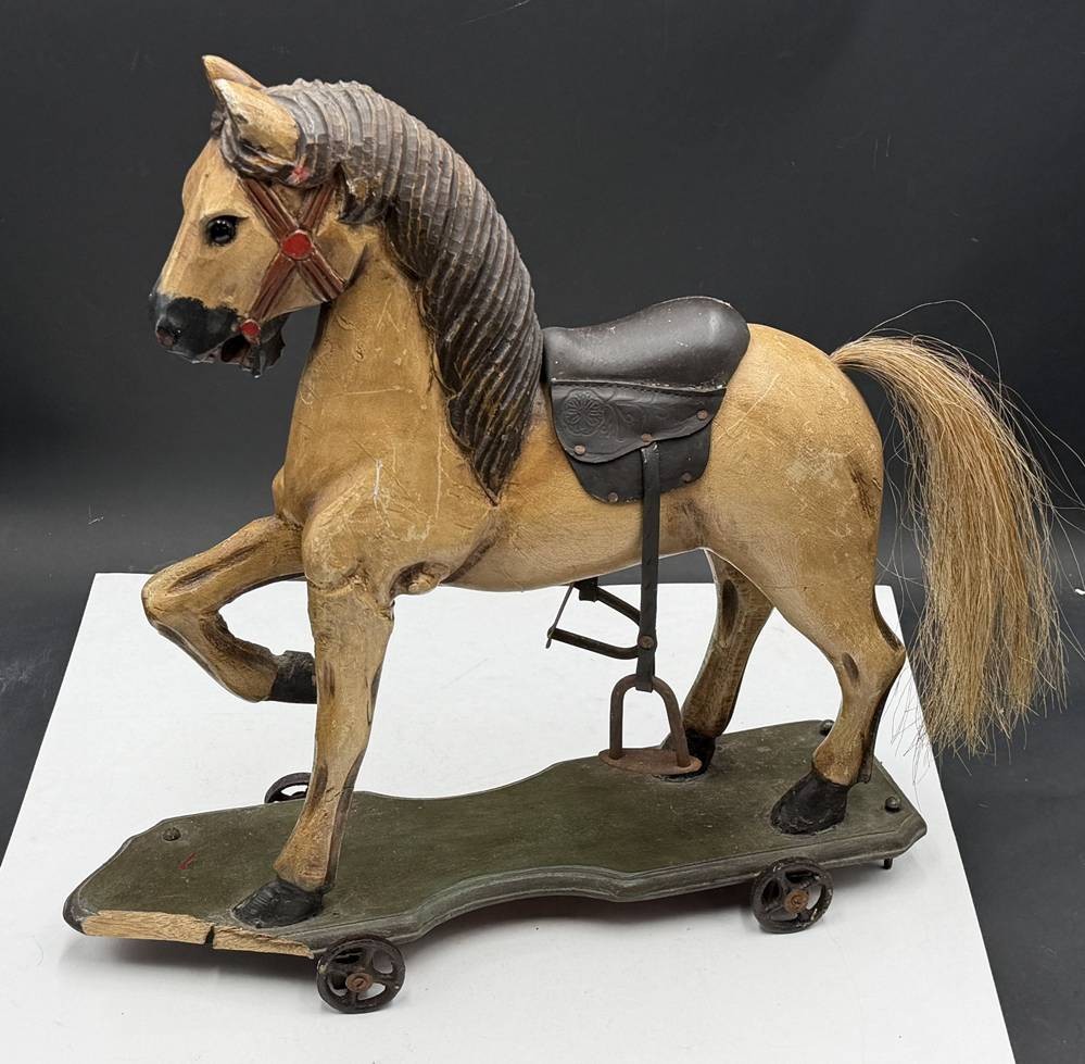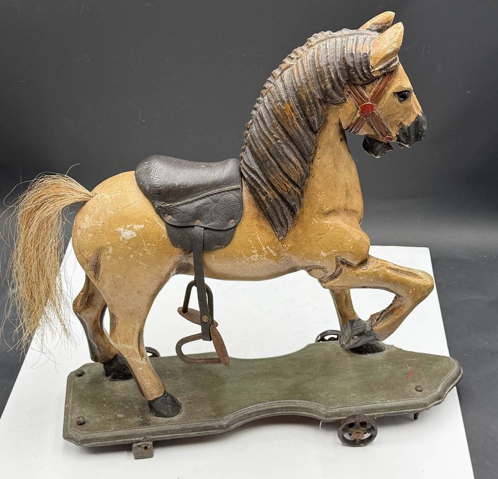 gesatteltes Nachziehpferd, Holz, farbig gefasst, Eisenrollen, vorne links Holz beschädigt. H-45 cm, L-44 cm [1]