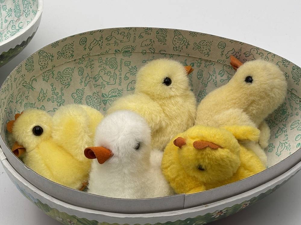gr. Papp Ei mit Osterdekor, innen 4 Stoff Küken mit Druckstimme?, Ei H-ca. 18 cm, 25x18 cm [1]
