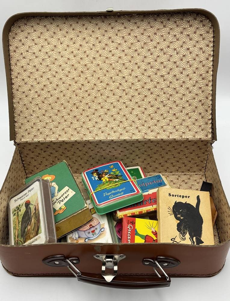 kl. Puppen-Handkoffer mit 10 alten Quartettspielen, hpts. Schwarzer Peter etc., Vollständigkeit nicht überprüft, H-9 cm, 20x33 cm [1]