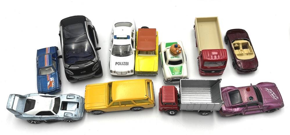 kl. Puppen-Handkoffer mit 11 x div. Druckguss-Autos, Koffer 8x20x14 cm