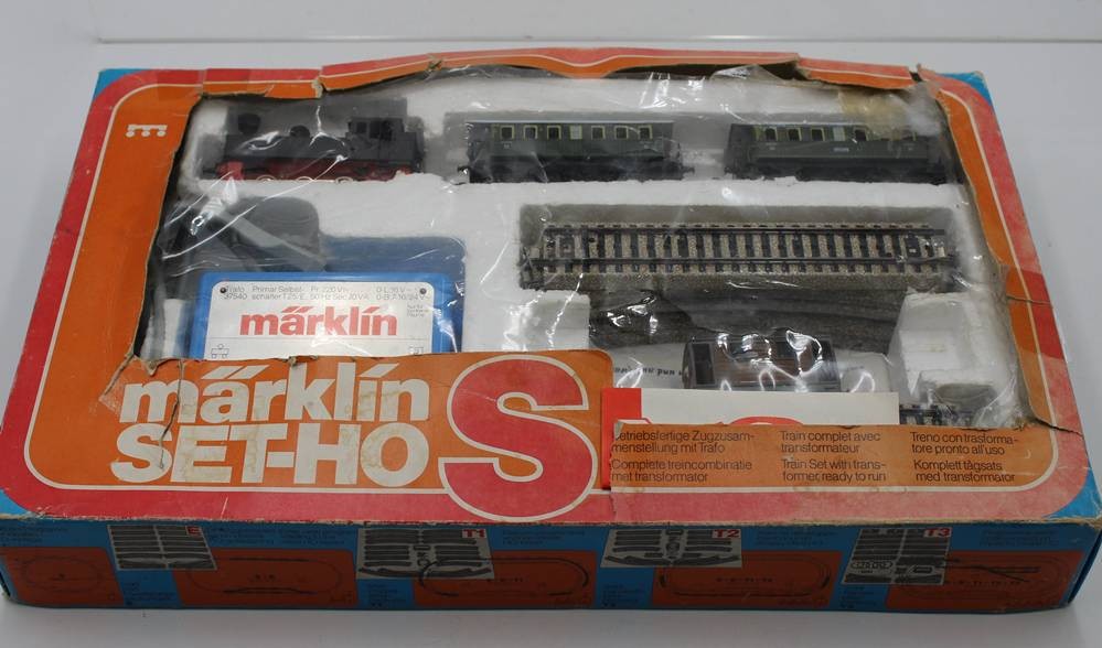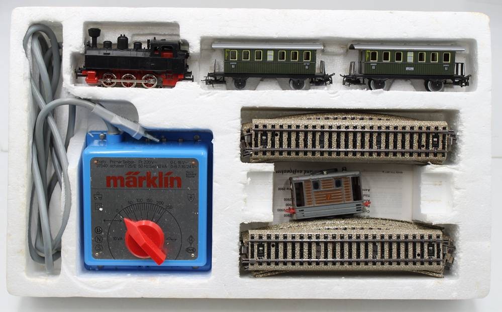 Märklin-Set, H0, Lok mit 2 Waggons, einigen Schienen und Trafo, nicht komplett, orig.Karton (beschädigt) [1]