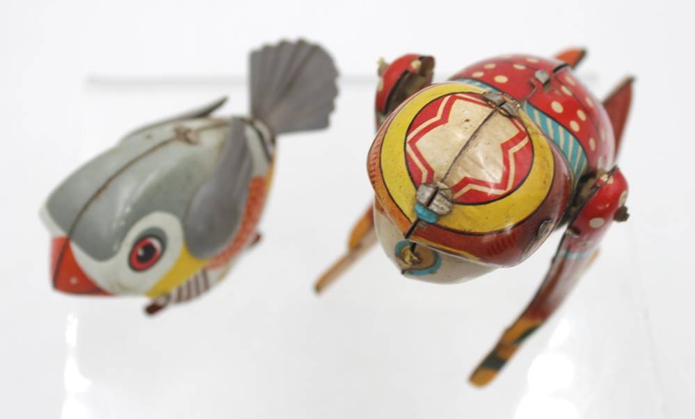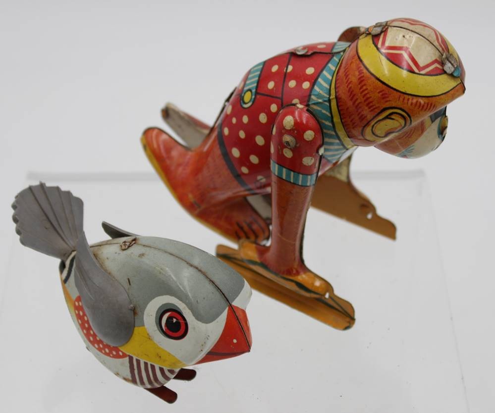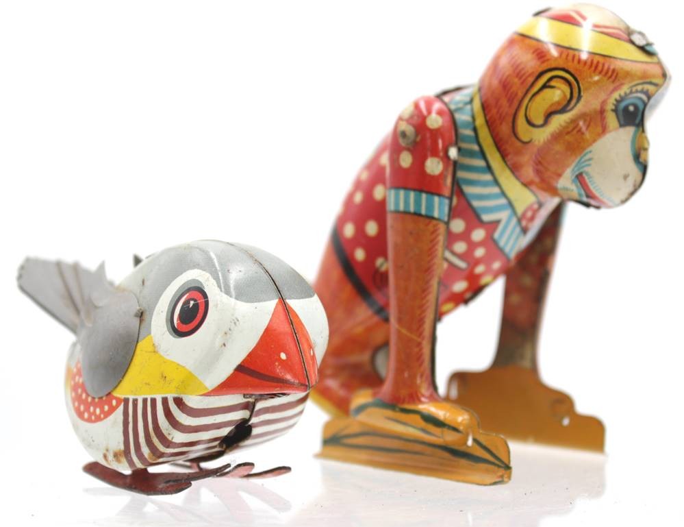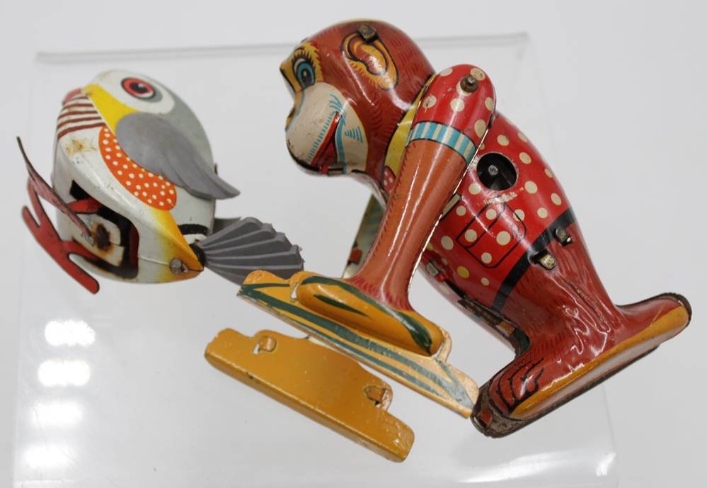 Pickvogel und Affe, Blech, älter, Schlüsselwerk bei Affe läuft, je mit Gebrauchsspuren, ca. H-11cm [1]