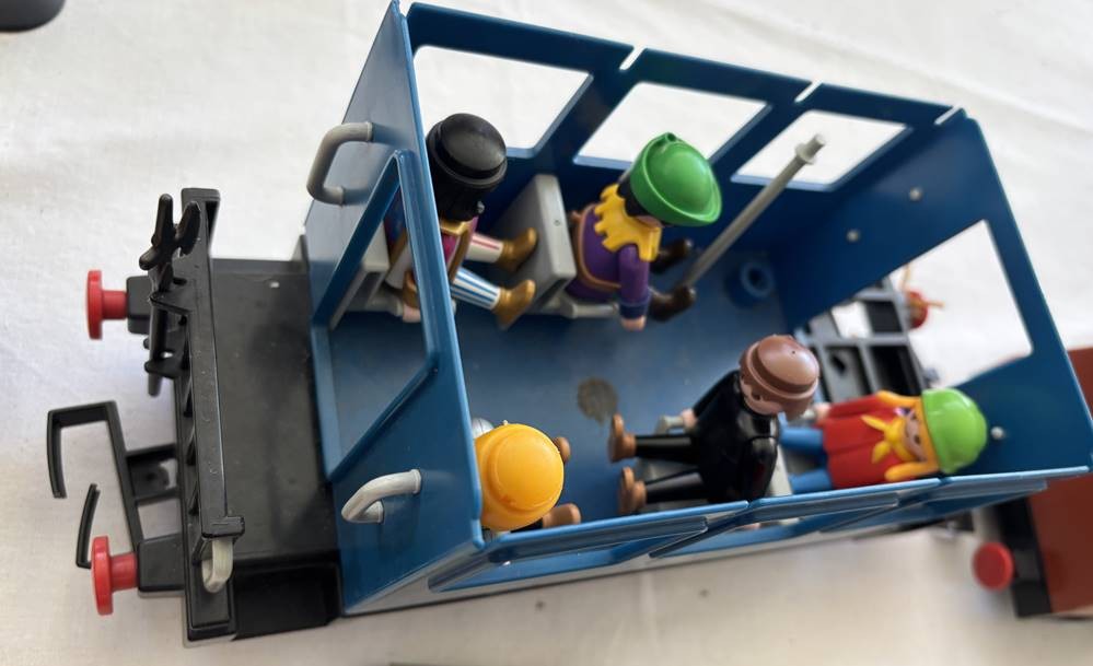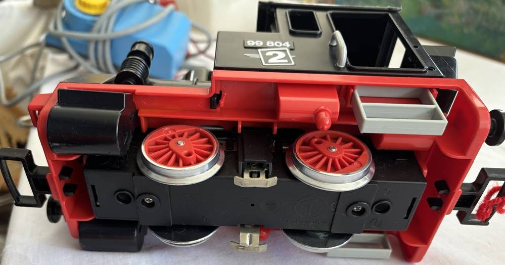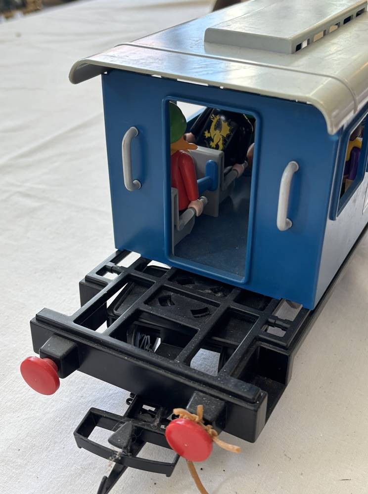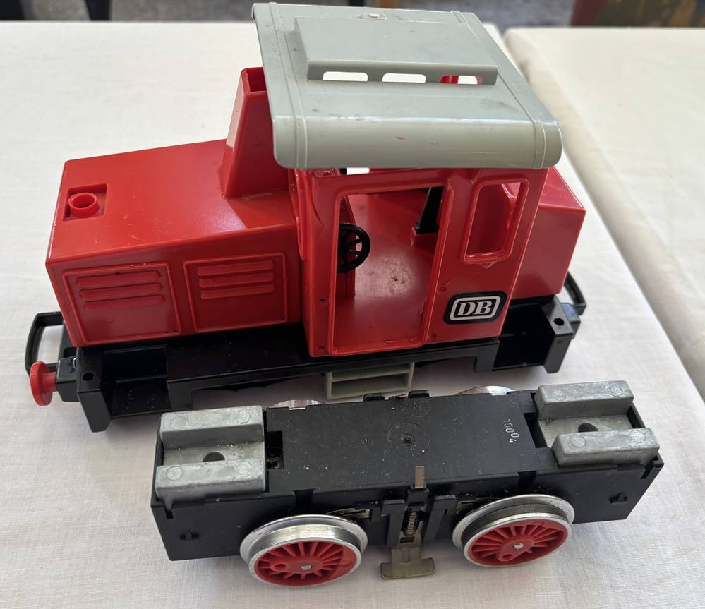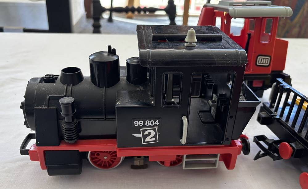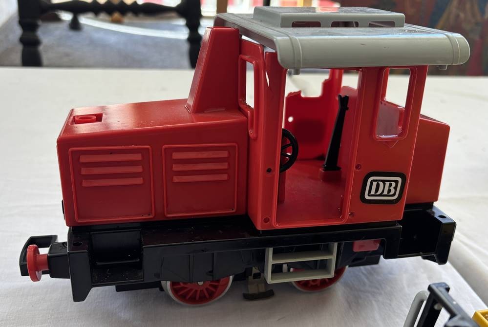 Playmobil elektrische Eisenbahn, Spur G L.G.B., 2 Lokomotiven, 4 Waggons, ca. 30-40 Schienen, 2 Trafos, einige Figuren, ungeprüfter Dachbodenfund, eine Lok in 2 Teilen? [1]
