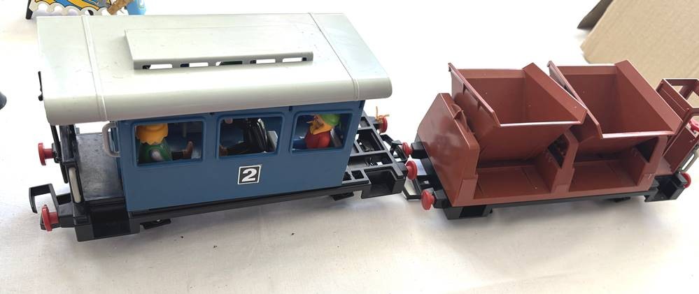 Playmobil elektrische Eisenbahn, Spur G L.G.B., 2 Lokomotiven, 4 Waggons, ca. 30-40 Schienen, 2 Trafos, einige Figuren, ungeprüfter Dachbodenfund, eine Lok in 2 Teilen?