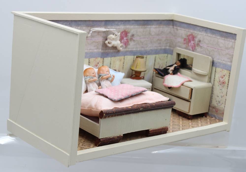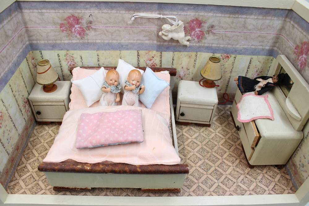 Puppenstube, Schlafzimmer um 1940/50, Holz, H-21 cm, 39x19 cm [1]
