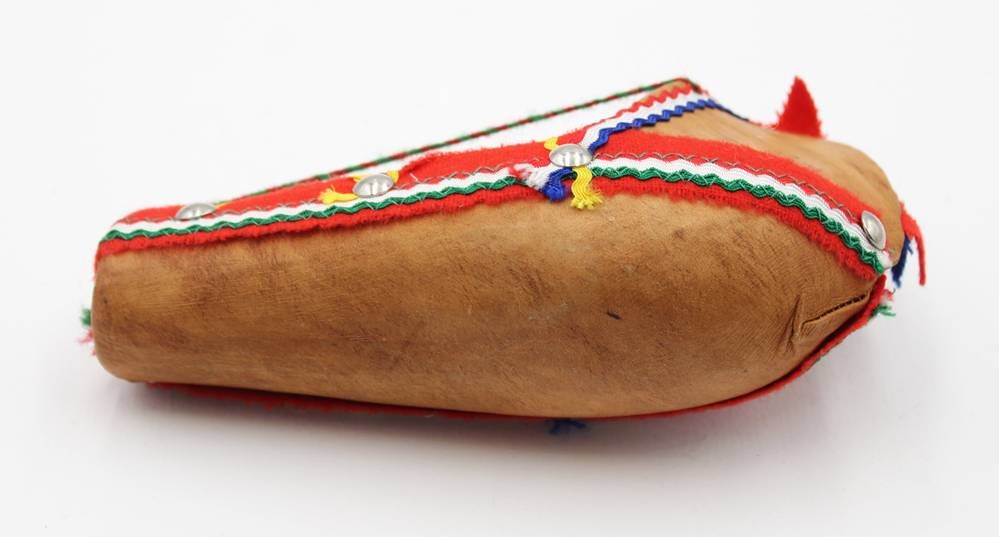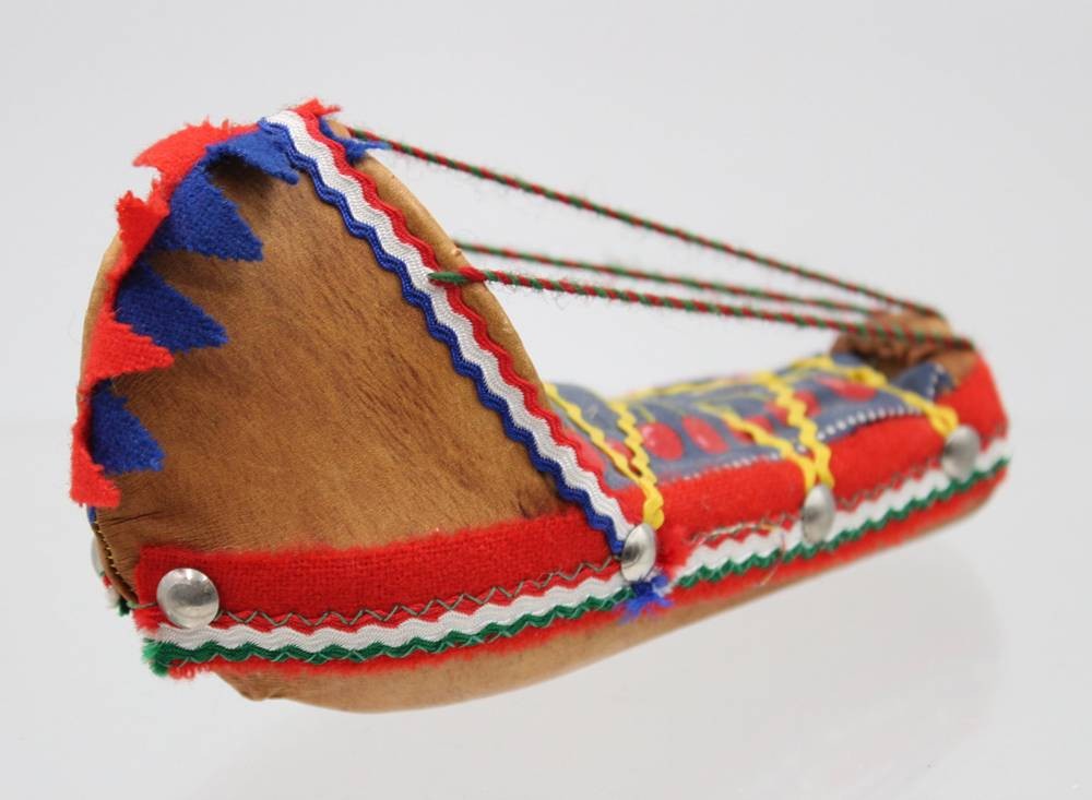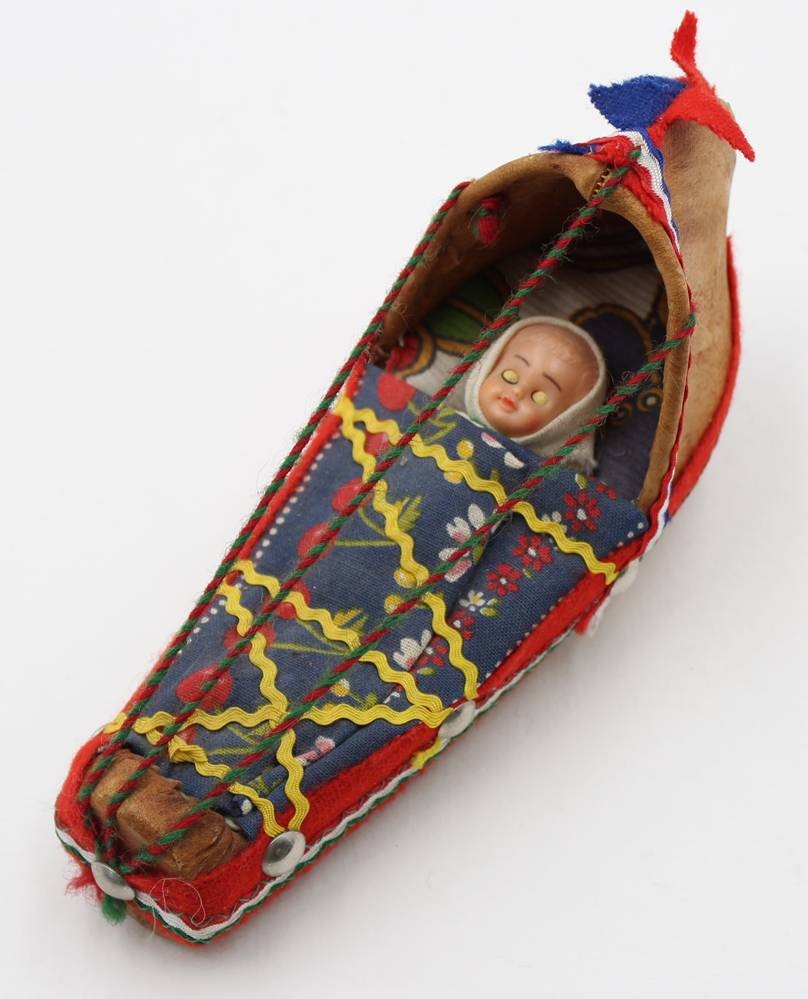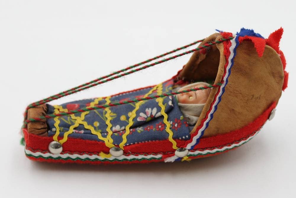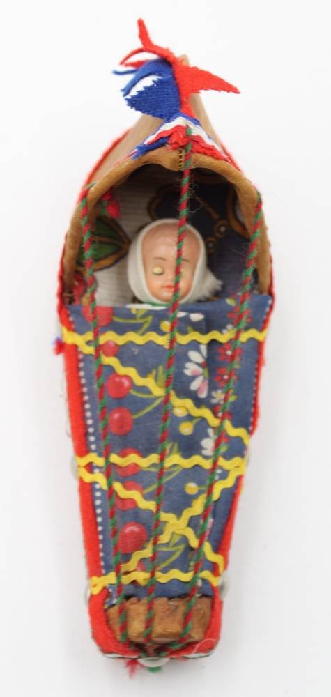 samische Wiege mit kl. Puppe, wohl 70er Jahre, ca. L-16,8cm H-9cm [1]