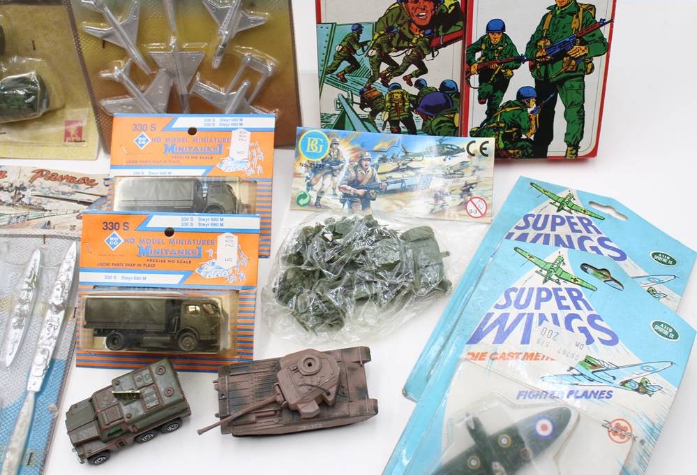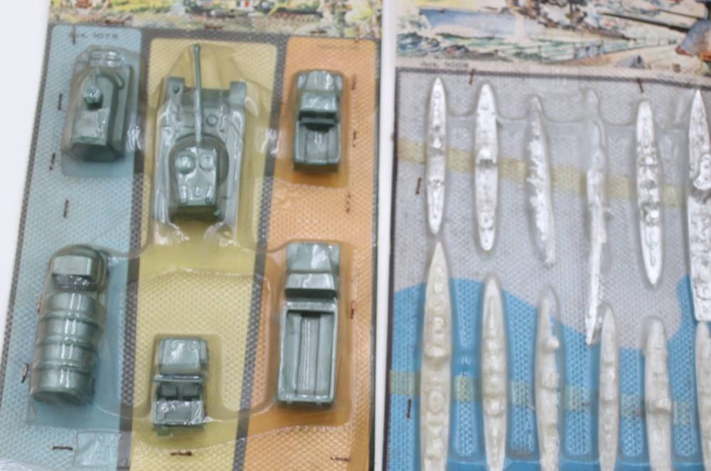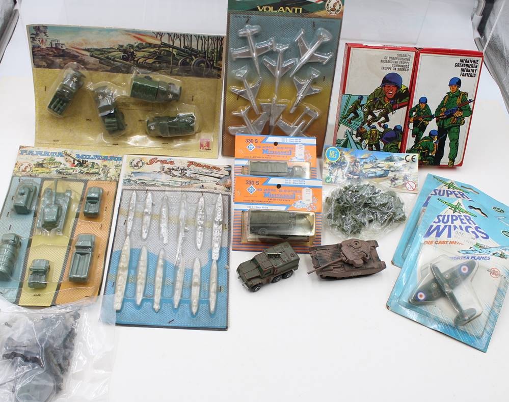 Sammlung von Vintage-Plastiksoldaten und Militärfahrzeugen, einiges in OVP