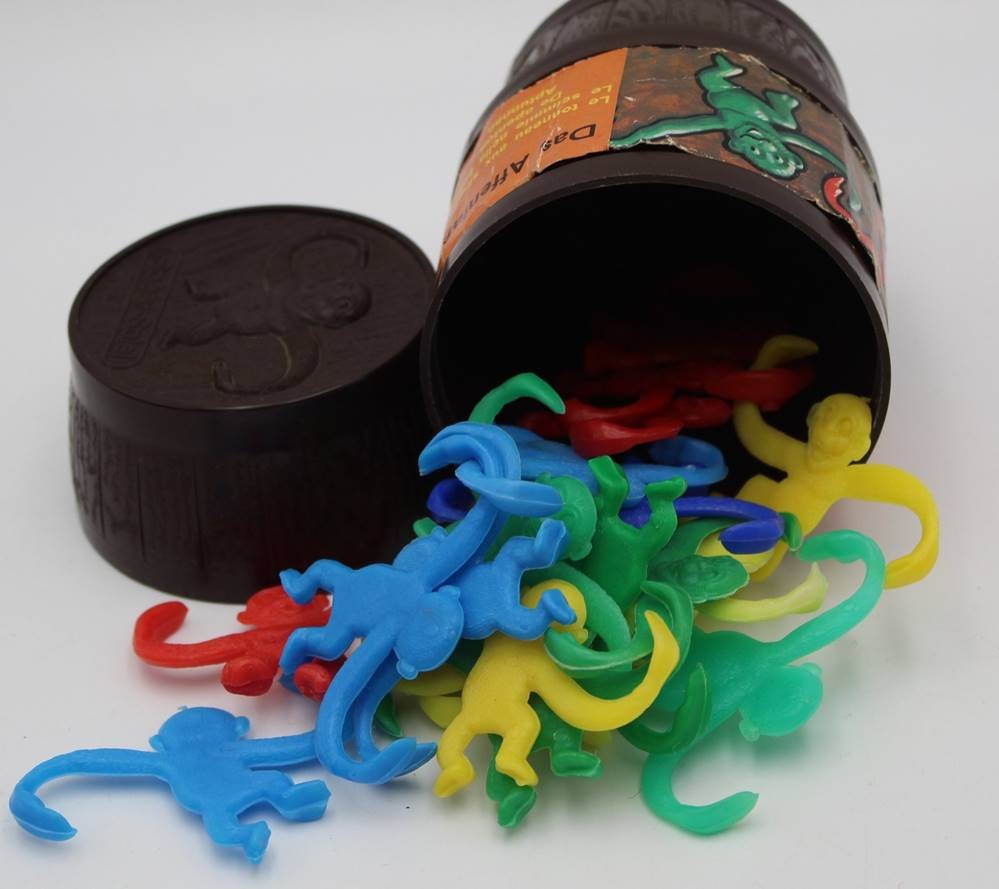 Spiel von 1968 "Das Affenfass" Kunststoff, H-12,5 cm