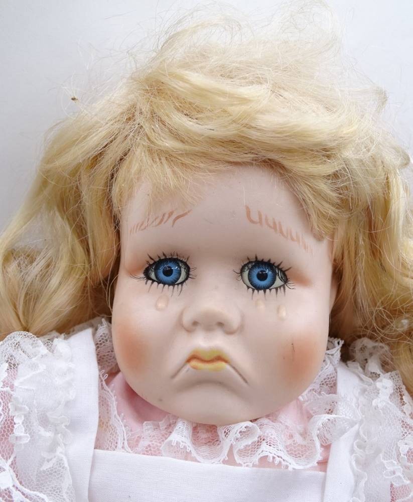 Weinende Kinderpuppe, Hände, Füße und Kopf aus Porzellan oder Kunstmasse, Glasaugen, H. ca. 30 cm, leichte Altersspuren, leicht reinigungsbedürftig [1]