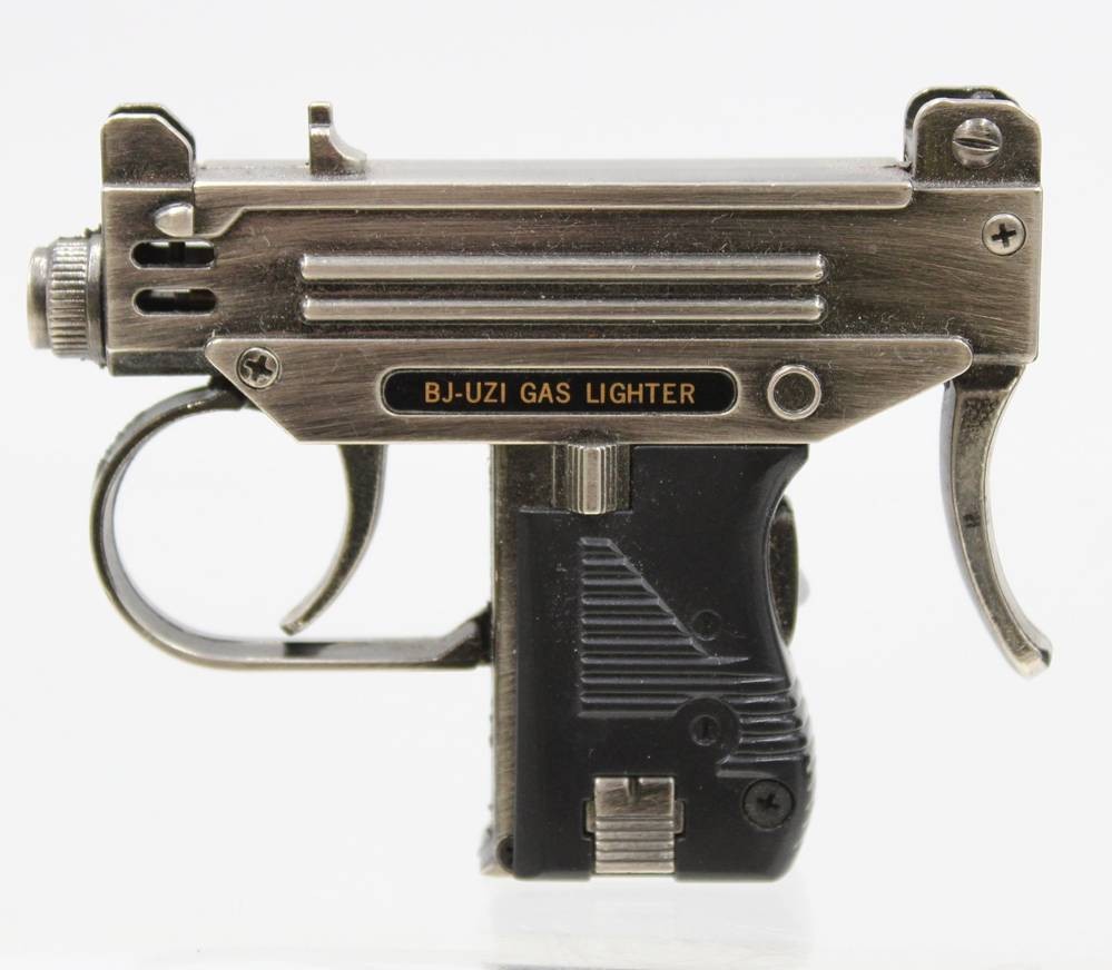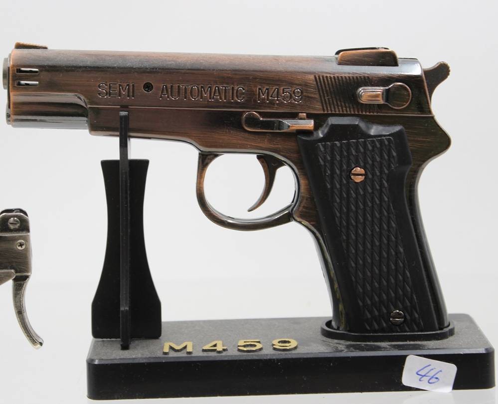 2x figürliche Feuerzeuge, Pistolen, 1x mit Halter, Größte ca. 9,5 x 13,5cm, Funktionen nicht geprüft [1]