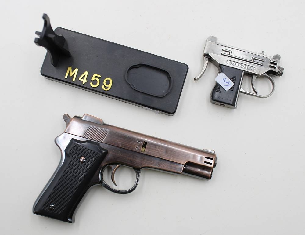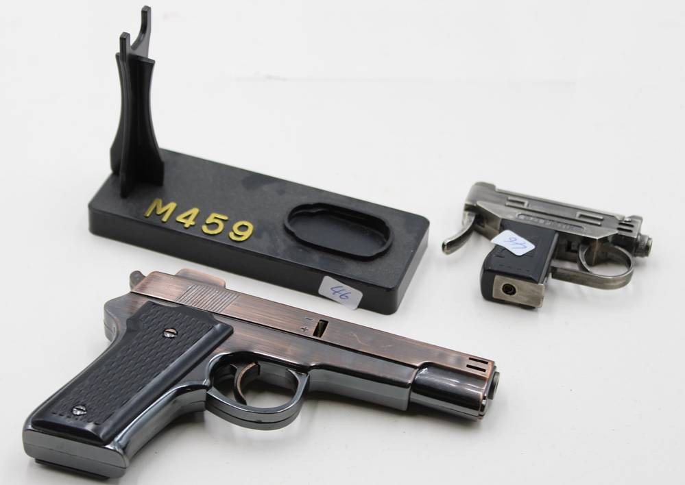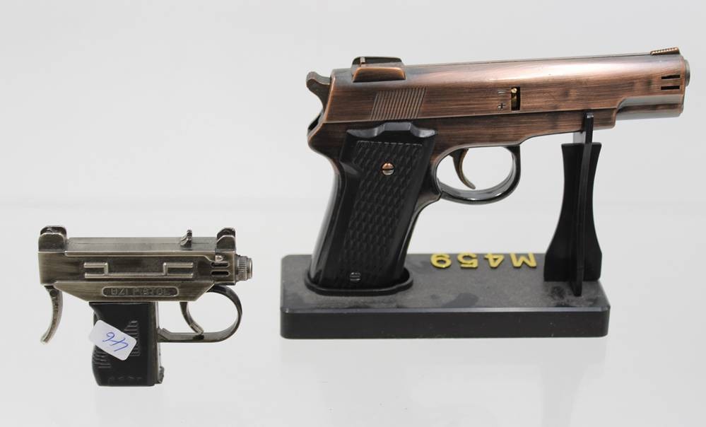 2x figürliche Feuerzeuge, Pistolen, 1x mit Halter, Größte ca. 9,5 x 13,5cm, Funktionen nicht geprüft