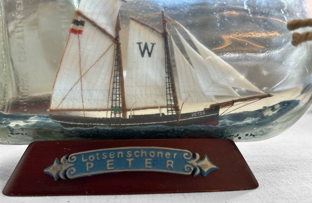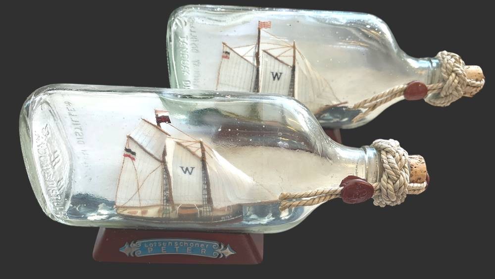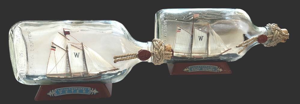 2x Flaschenschiffe, Lotsenboote, 1x "Stadt Bremen" 1x "Peter"L-22 cm, H-11 cm mit Ständer, Handarbeit [1]