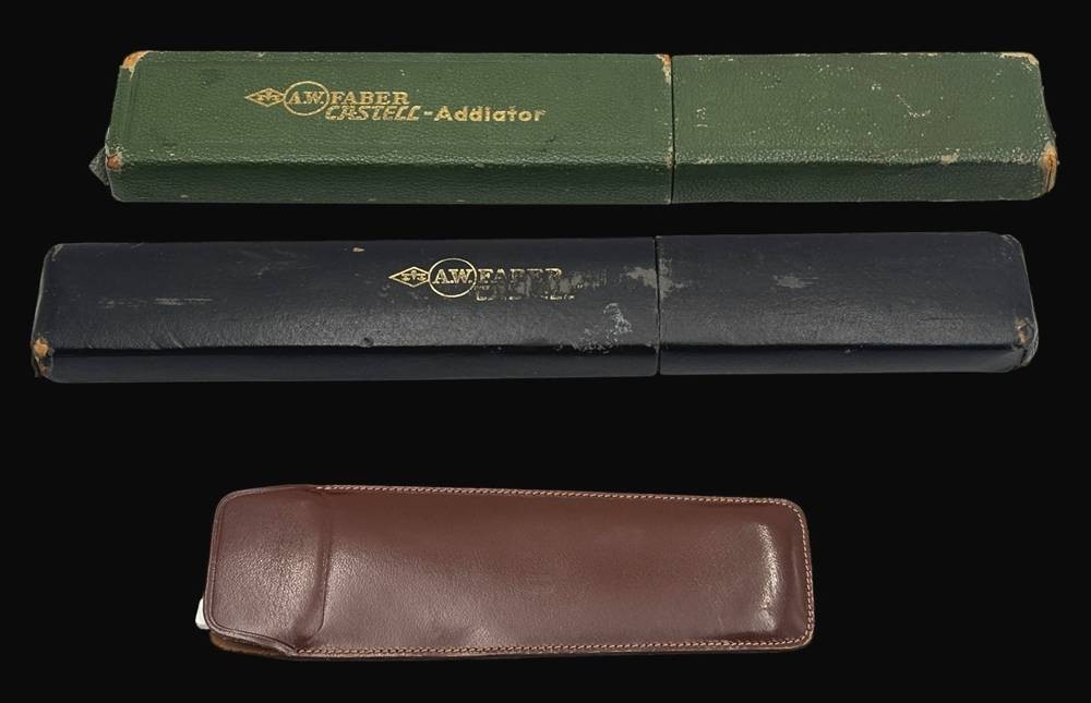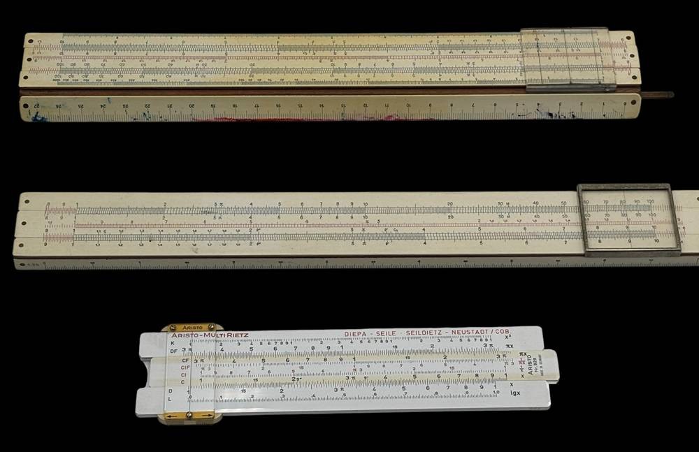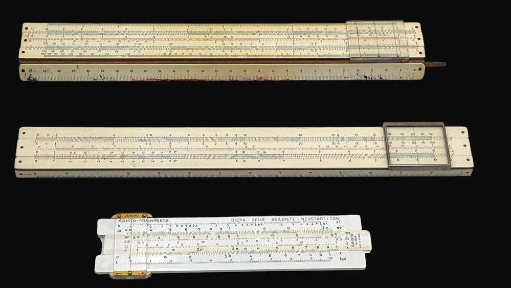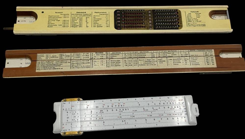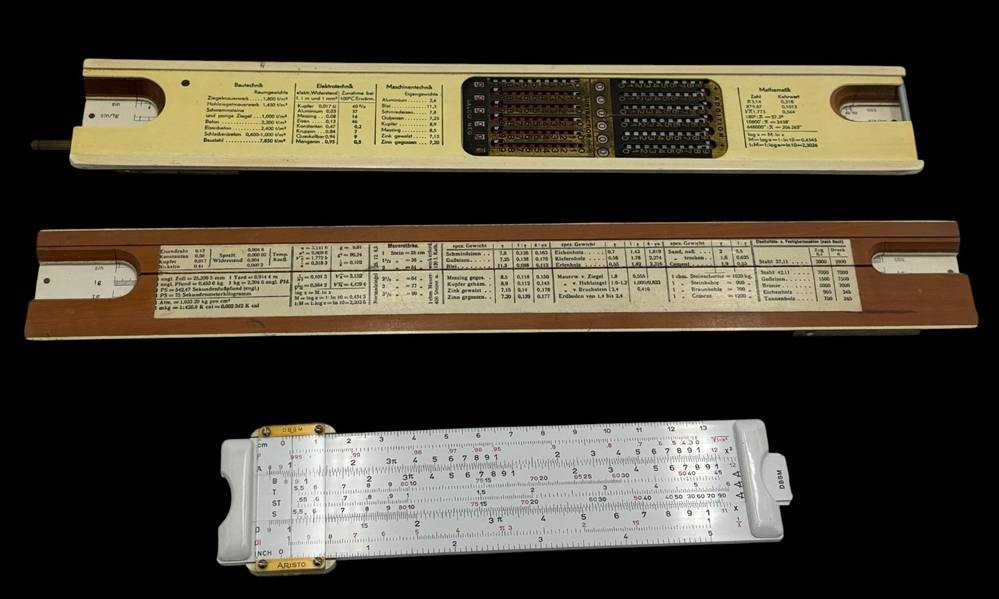 3x div. Rechenschieber, 2x in orig. Kartons, 1x in Lederhülle, 2x Faber-Castell, 1x Aristo
