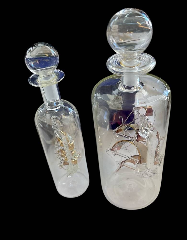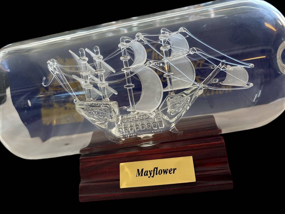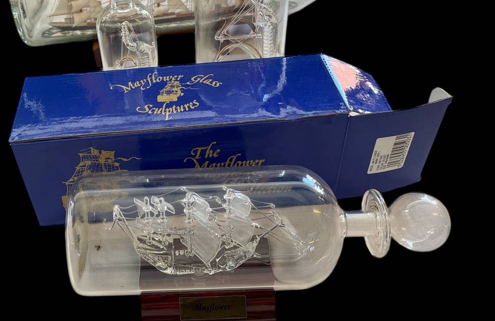 3x Glas-Buddelschiffe, 1x Mayflower mit Ständer, orig. Karton, L-max. 24 cm [1]