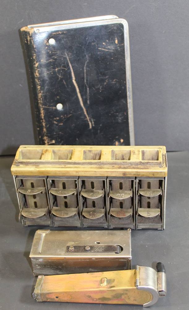 3x Schaffner-Werkzeug, Wechselgeldbehälter, Fahrkartenmappe, Stempel, ungepflegter Kellerfunmd