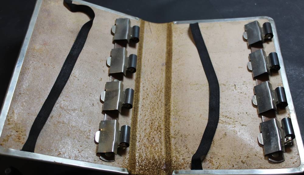3x Schaffner-Werkzeug, Wechselgeldbehälter, Fahrkartenmappe, Stempel, ungepflegter Kellerfunmd [1]