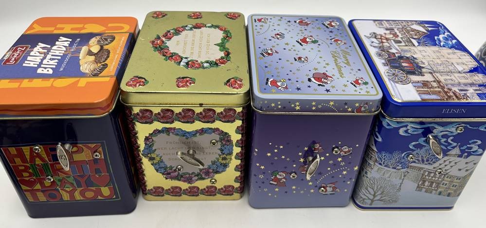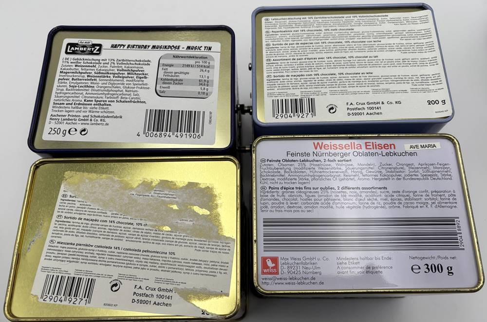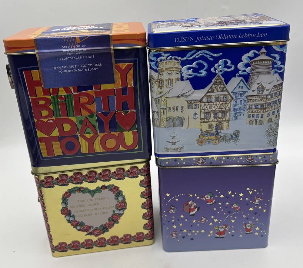 4 Blechdosen mit Spieluhren, alle Werke laufen, gut erhalten, 12 x 9 x 12 cm, Leibnitz und Lebkuchen etc. [1]