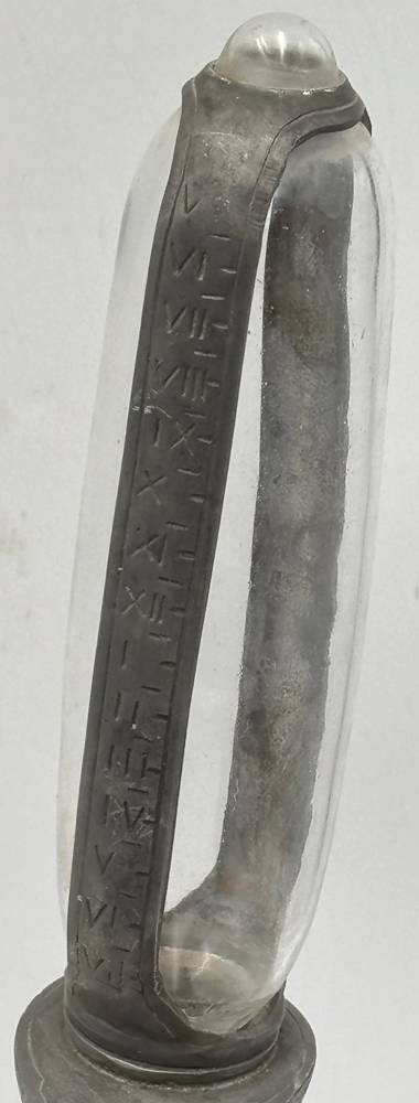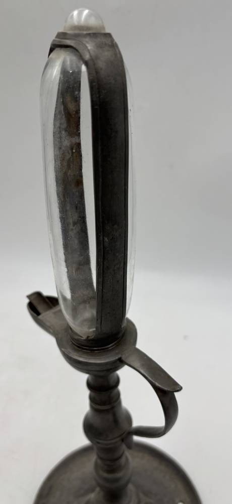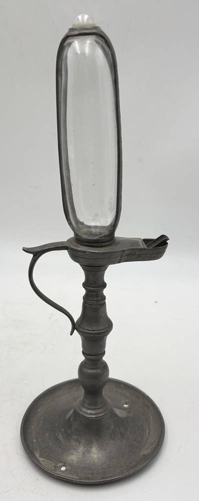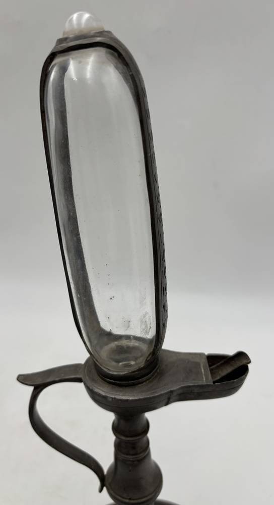 alte Zinn-Öllampe mit Glasbehälter, seitl. Stundeneinteilung, guter Zustand, H-34 cm [1]