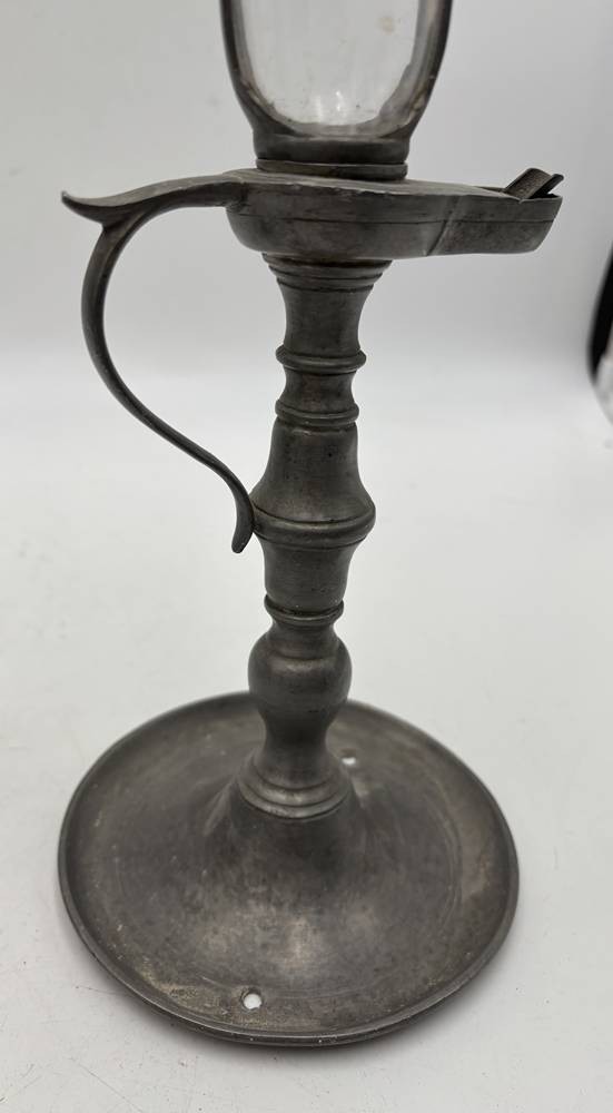 alte Zinn-Öllampe mit Glasbehälter, seitl. Stundeneinteilung, guter Zustand, H-34 cm
