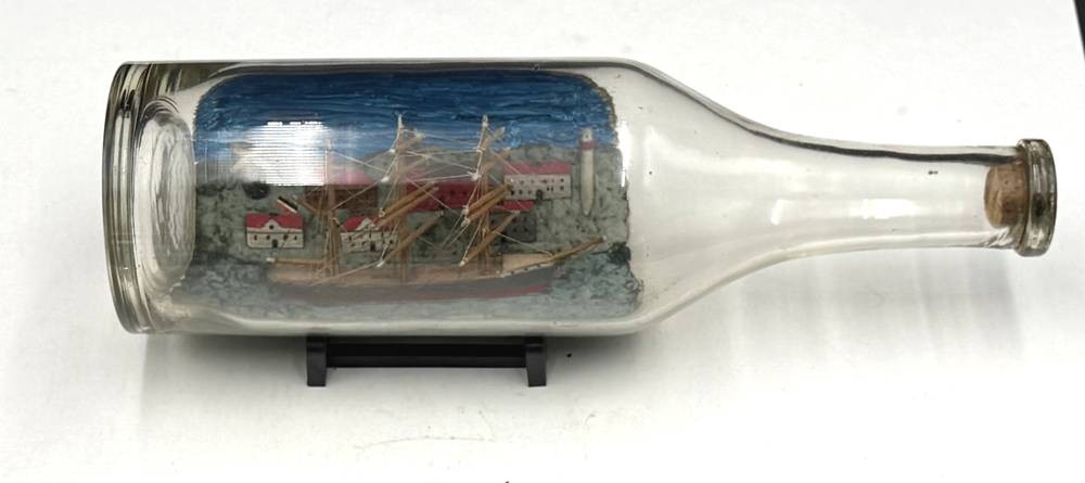 altes Buddelschiff mit Diorama, DR-Fahne, L-29 cm