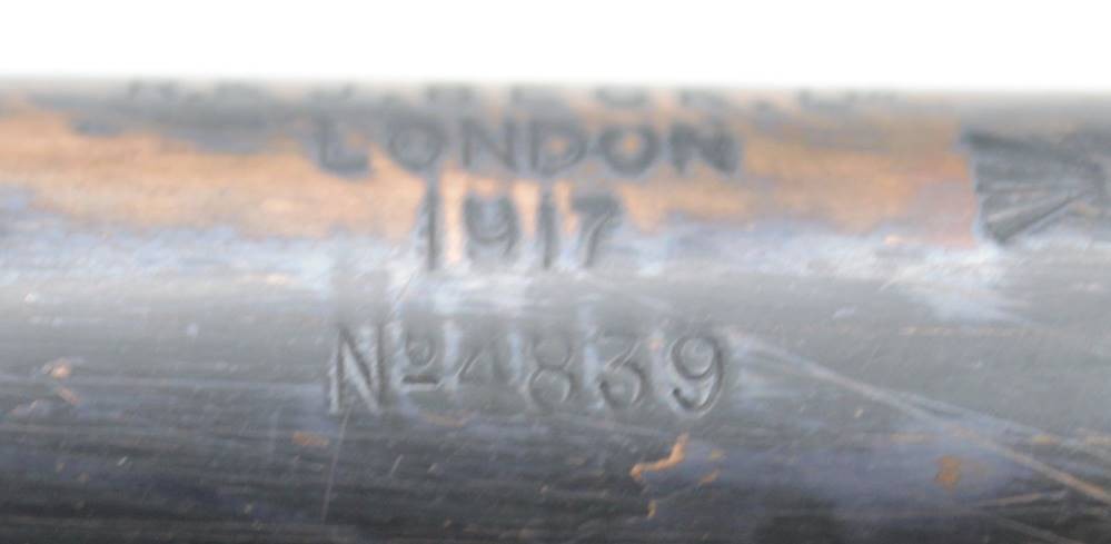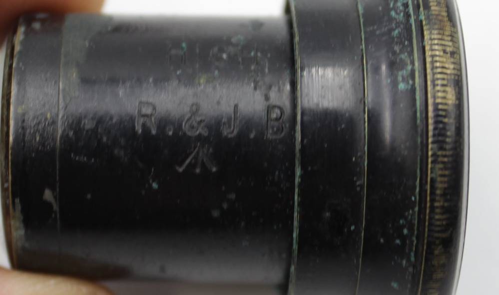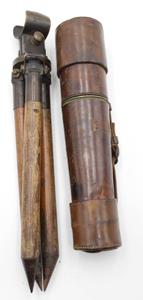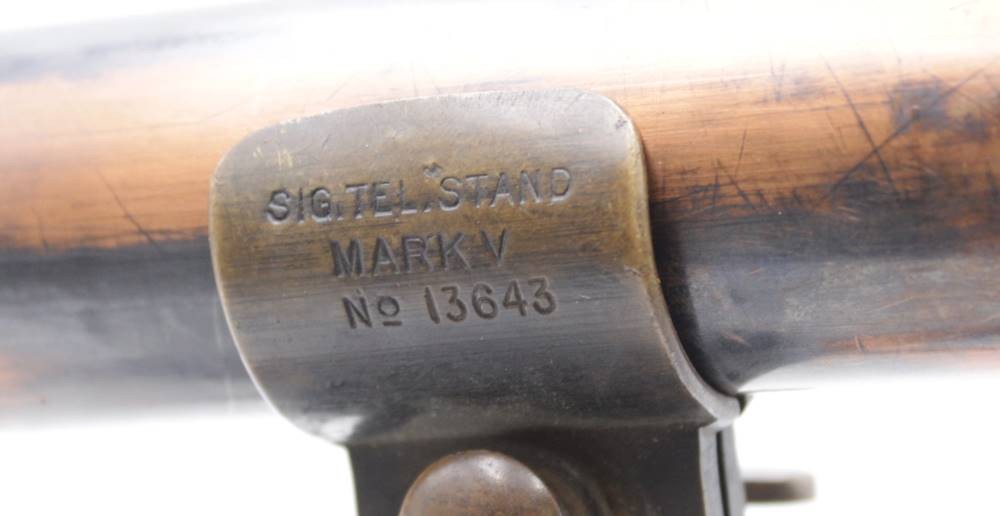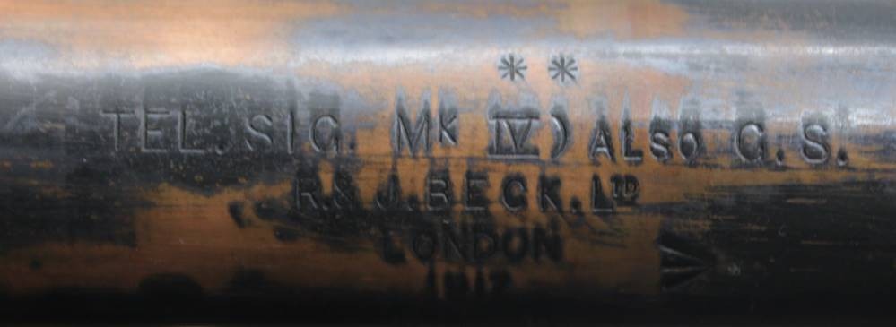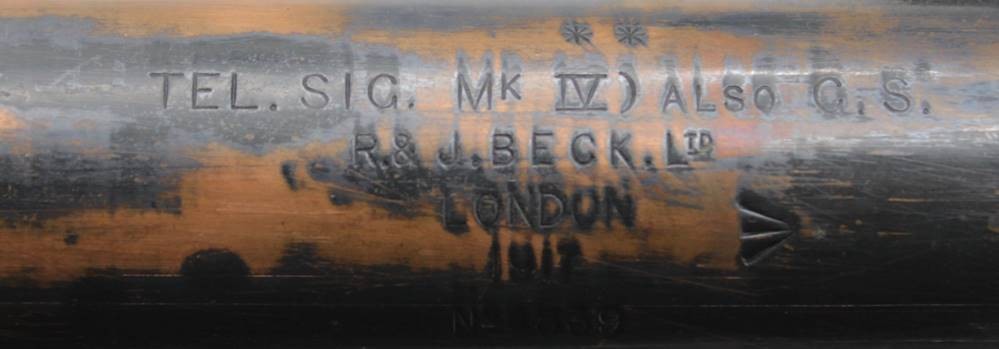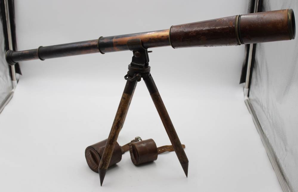 altes Teleskope auf Stand, R. & J. BECK Ltd. LONDON 1917 No. 4839, Optik klar, Gehäsue mit Alters-u. Gebrauchsspuren, ca. L-92cm ausgezogen, H- mit Stand 37cm. [1]