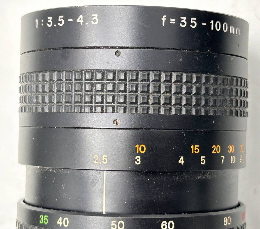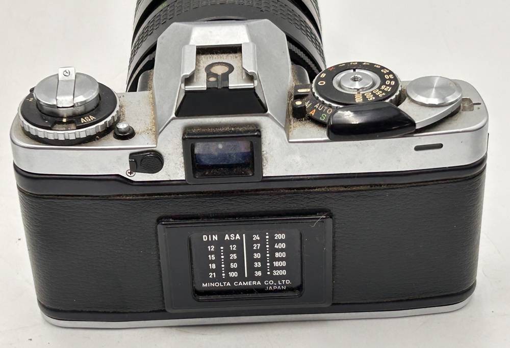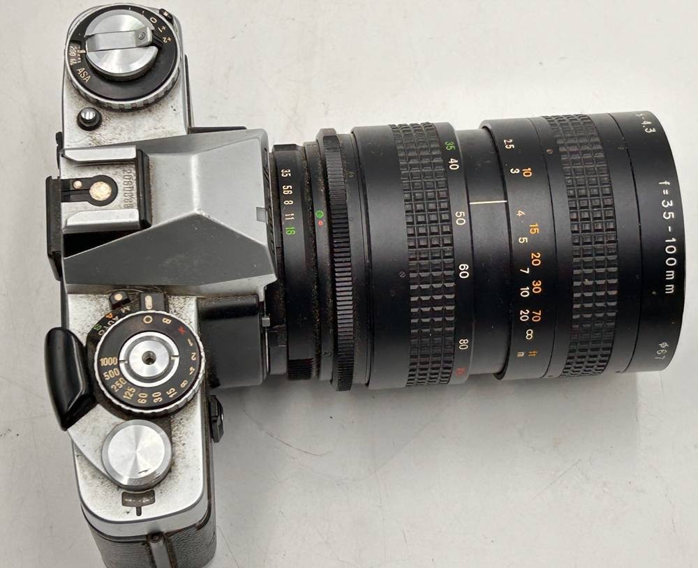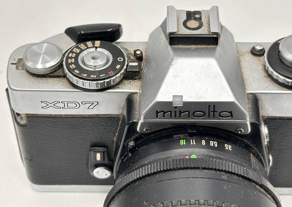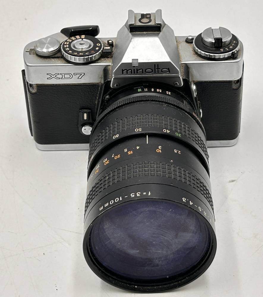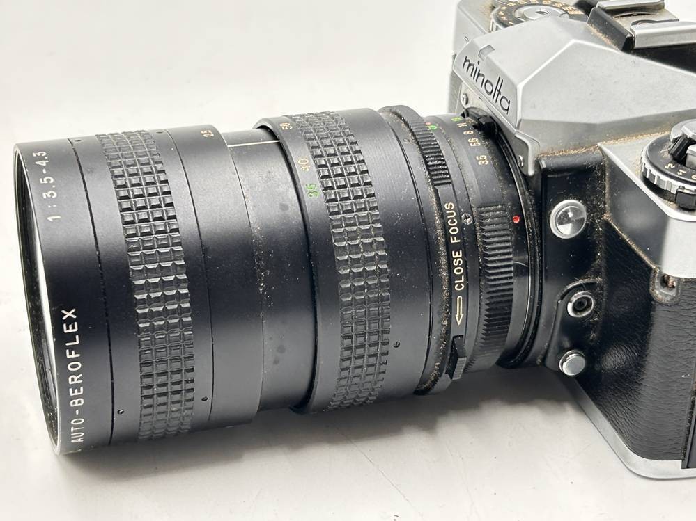 Analoge Kamera Minolta XD7 mit Teleobjektiv Auto Beroflex 1:3,5-4,3, f-35-100 mm, Kamera verstaubt [1]