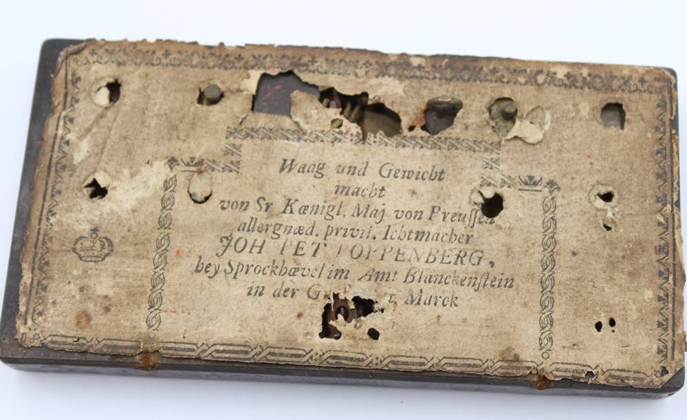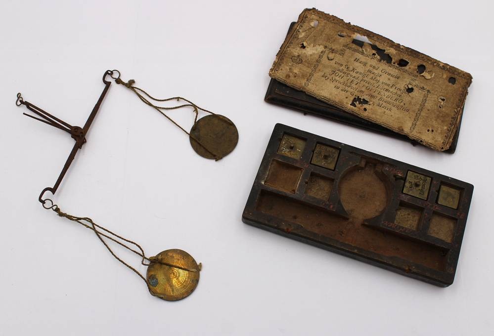 antike Münzwaage , wohl 18. Jhd., alter Holzkasten, nicht komplett, Altersspuren [1]