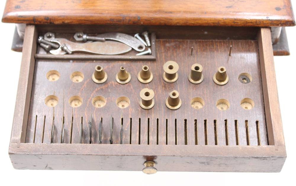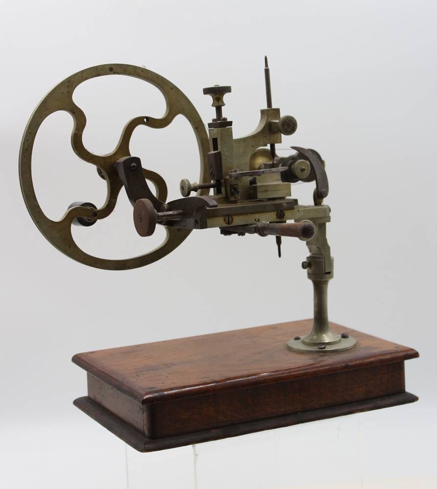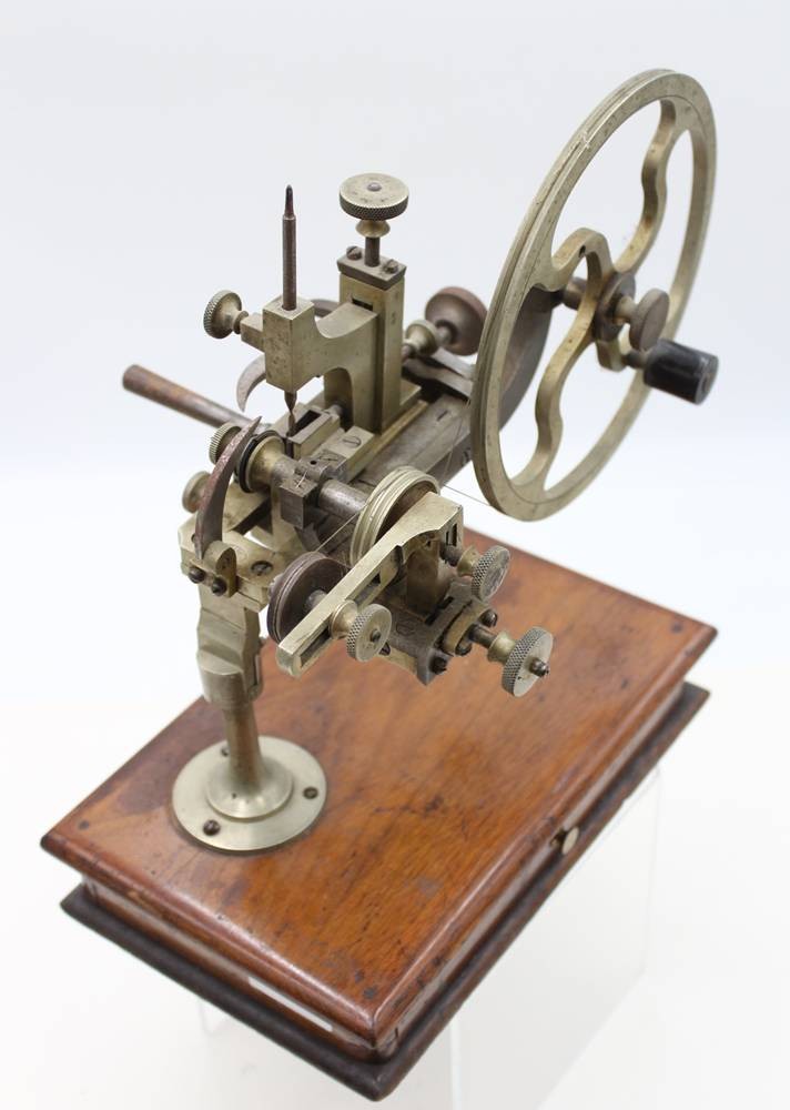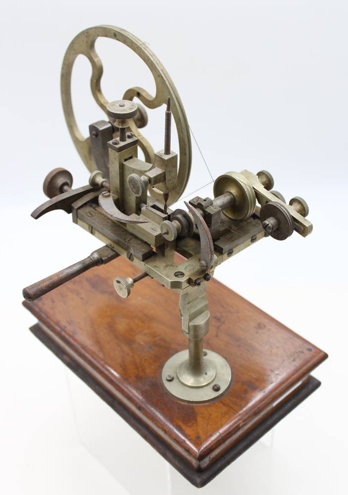antike Uhrmacherdrehbank, R. Flume Berlin, Altersspuren, ca. H-29cm B-29cm