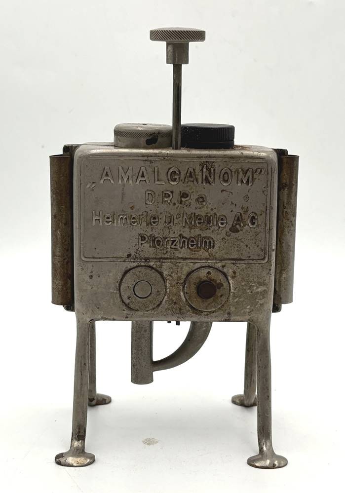 antikes "Amalganom" Gerät zum Herstellen von Zahnfüllungen, D.R.P. (Deutsches Reich Patent" mit Zubehör um 1920, H-20 cm [1]