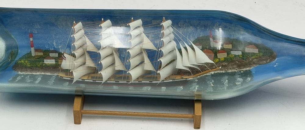 Buddelschiff in 3 L Flasche , Segelschiff Hamburg vor Diorama mit Leuchtturm, L-50 cm