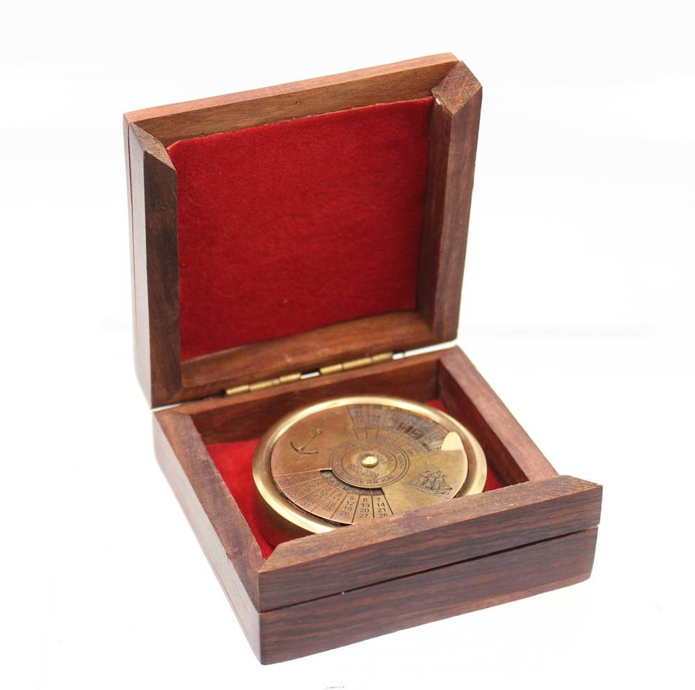 ewiger Messing-Kalender (100-Jahre-Kalender) im nautischen Design, 2000-2099, in Holzkasten (beschädigt), Kalender D-5cm