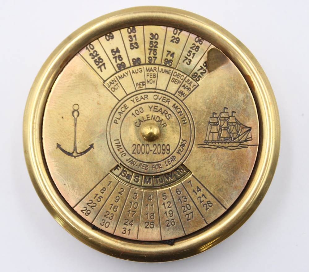 ewiger Messing-Kalender (100-Jahre-Kalender) im nautischen Design, 2000-2099, in Holzkasten (beschädigt), Kalender D-5cm [1]