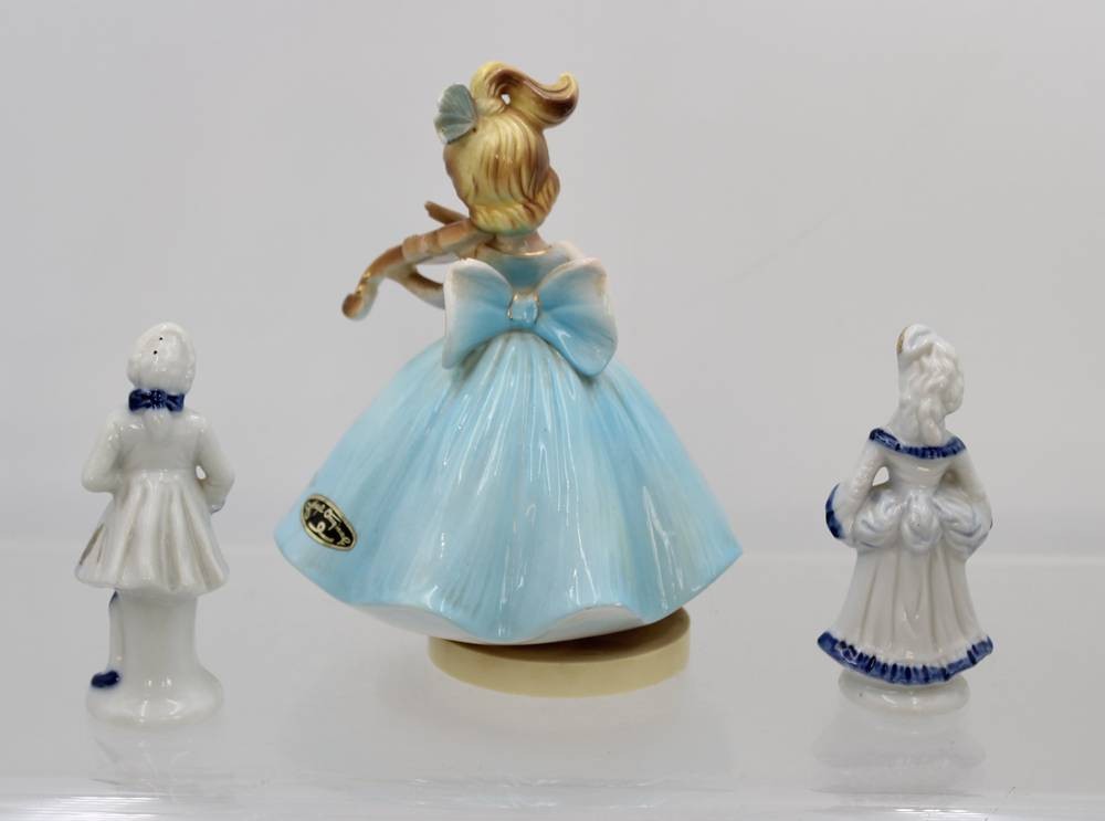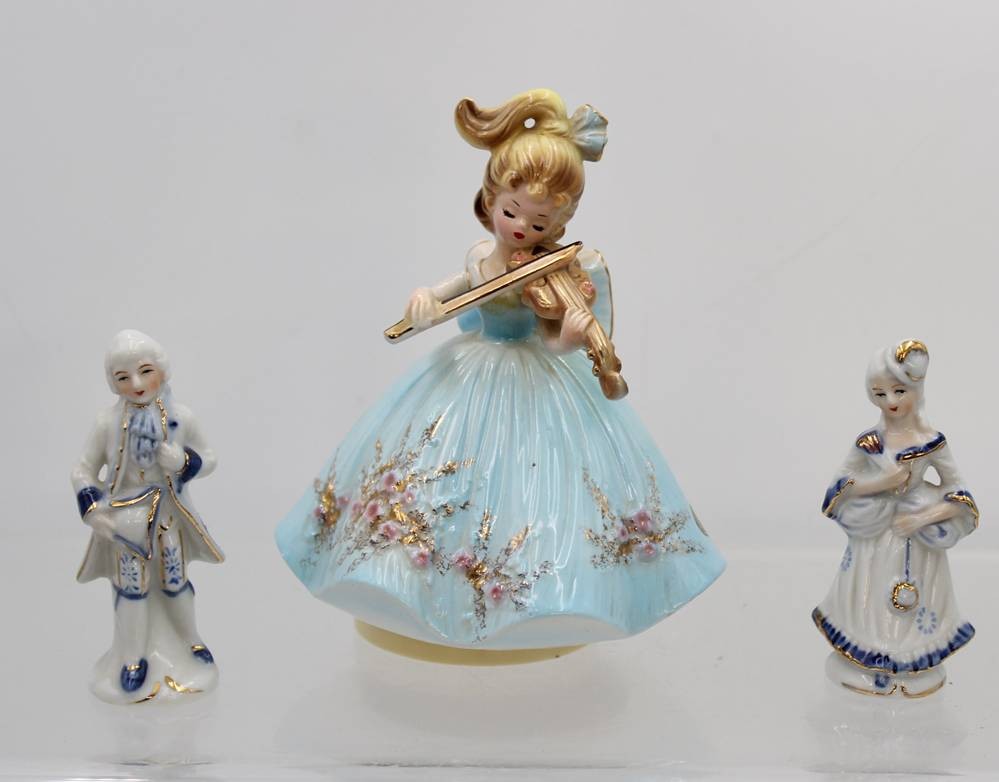 figürliche Spieluhr, Josef Originals, anbei 2 Nippesfiguren aus Porzellan, ca. H-10cm und H-16cm
