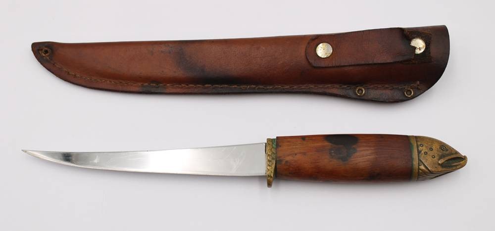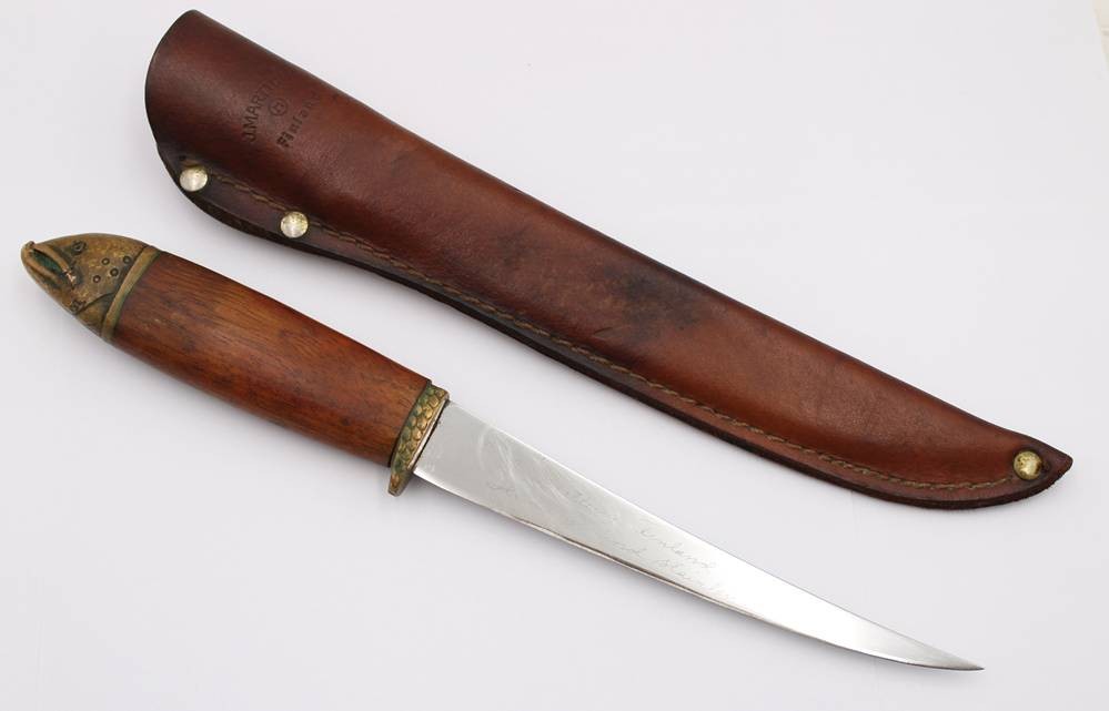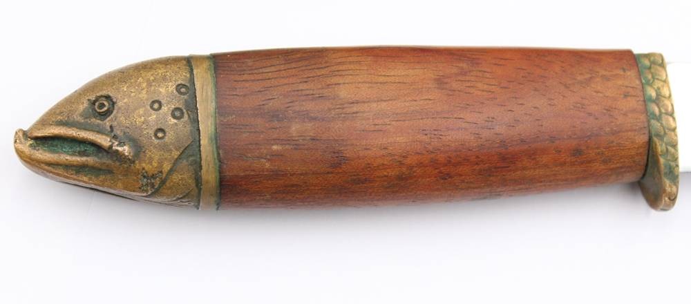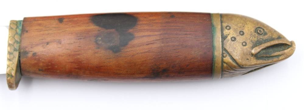 Fischmesser, J. Marttiini, Finnland, figürlicher Griff aus Bronze, ca. L-33cm