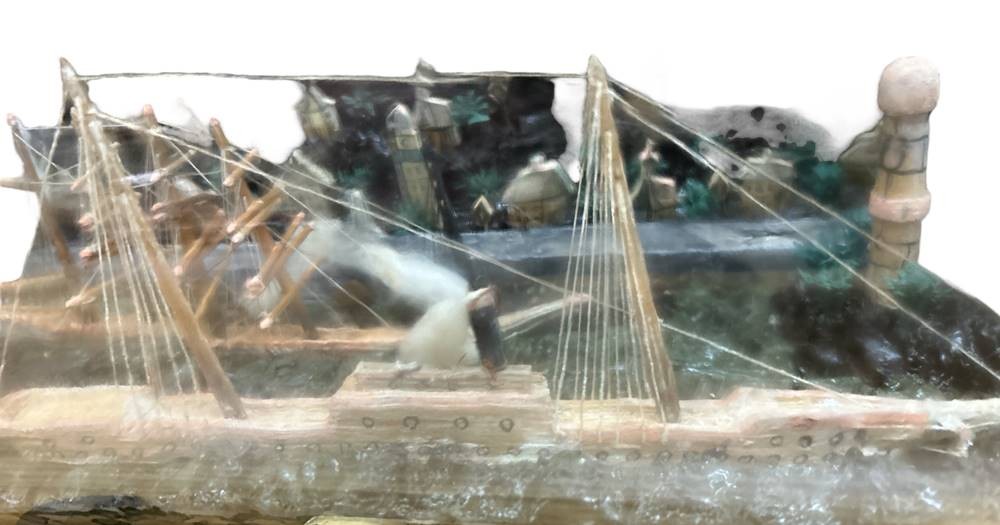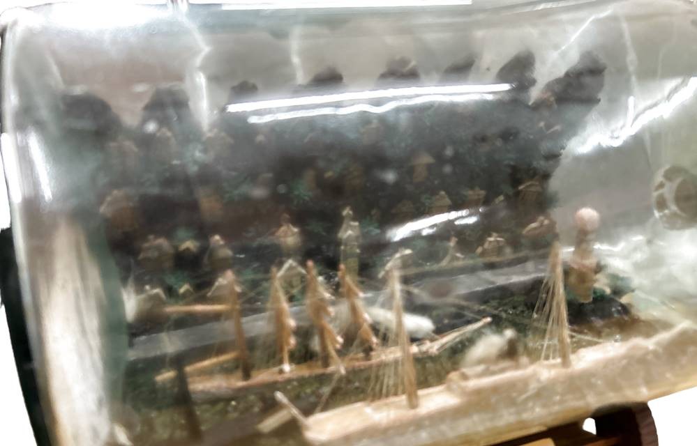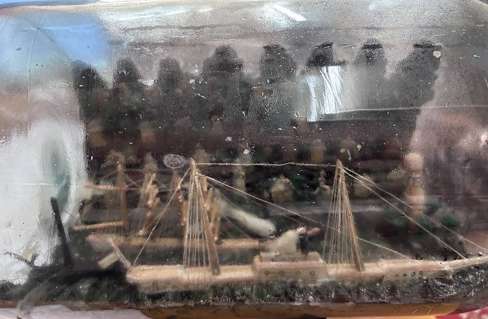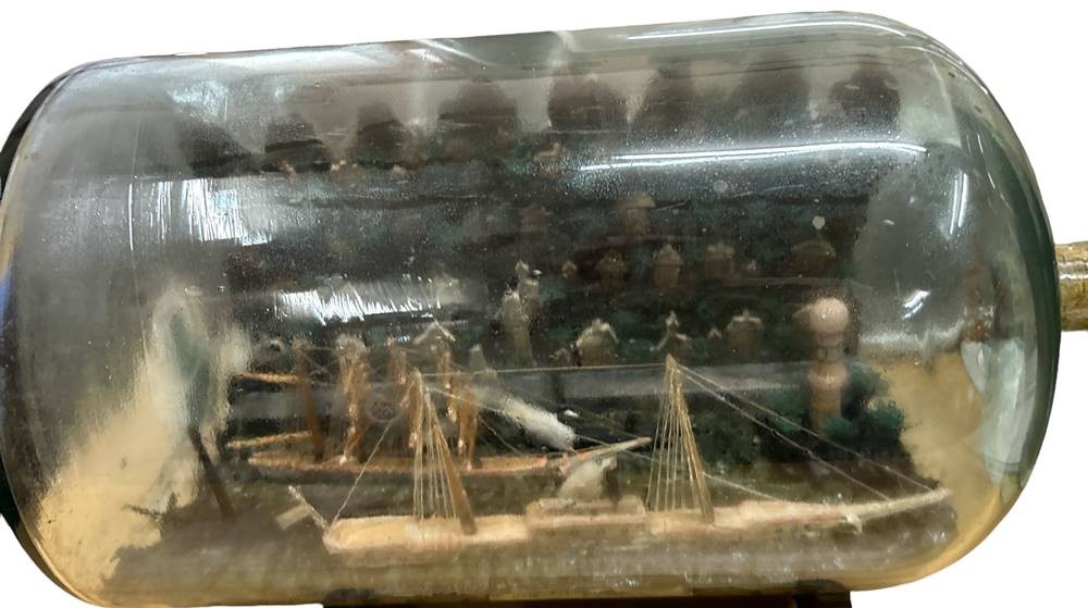gr. Buddelschiff mit 2 Segelschiffen und Panorama, H-21 cm, L-41 cm [1]