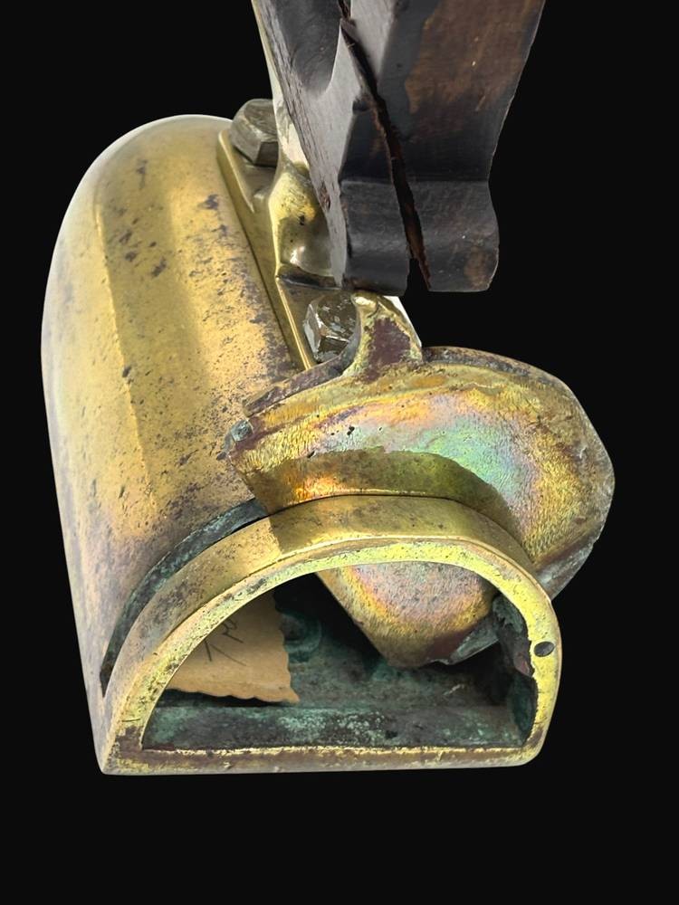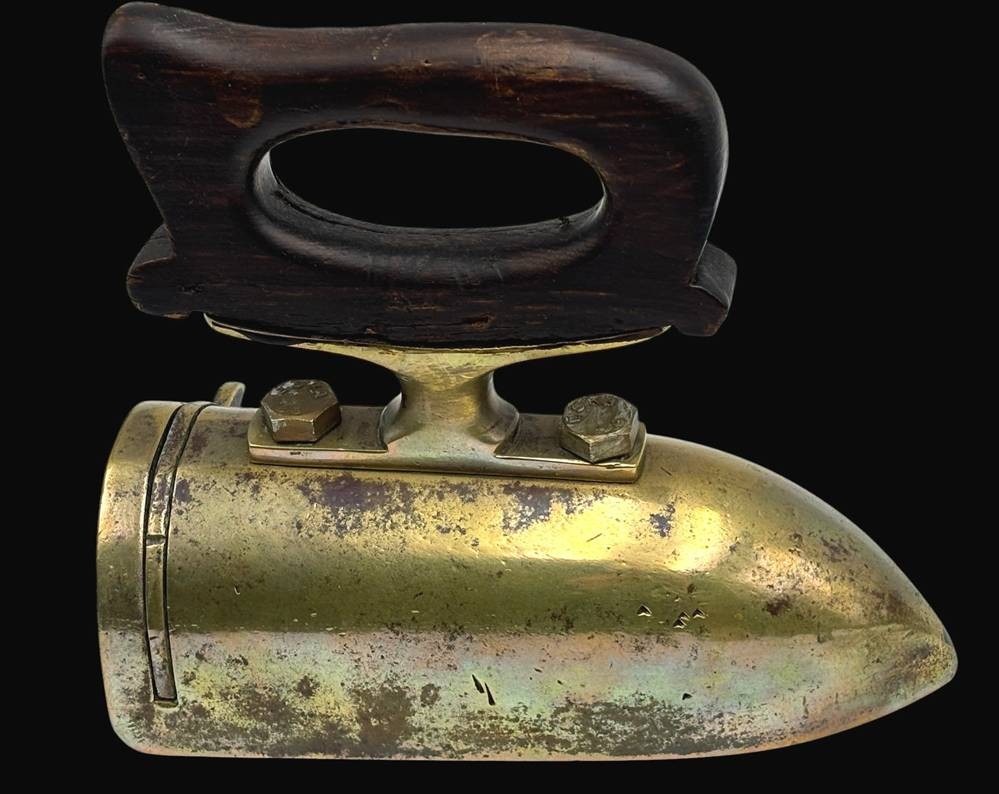 gr. Bügeleisen, Messing mit Holzgriff, Eisen-Kern fehlt, H-17 cm, L-19 cm [1]