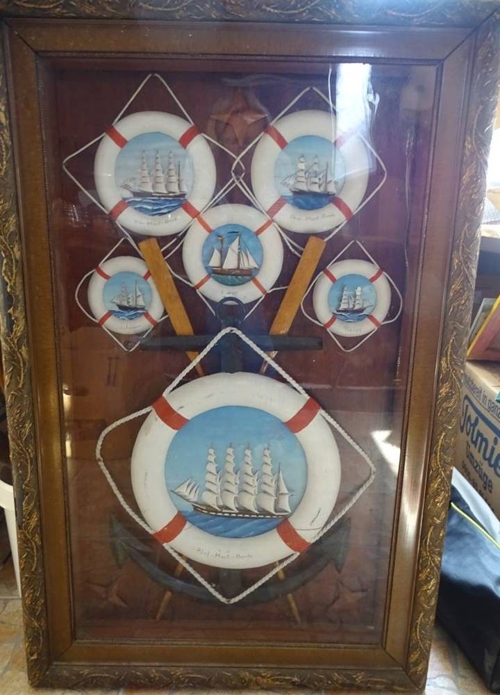gr. Schaukasten mit Darstellungen verschiedener Segelschiff-Typen in Rettungsringen, hinter Glas, RG 100x65 cm