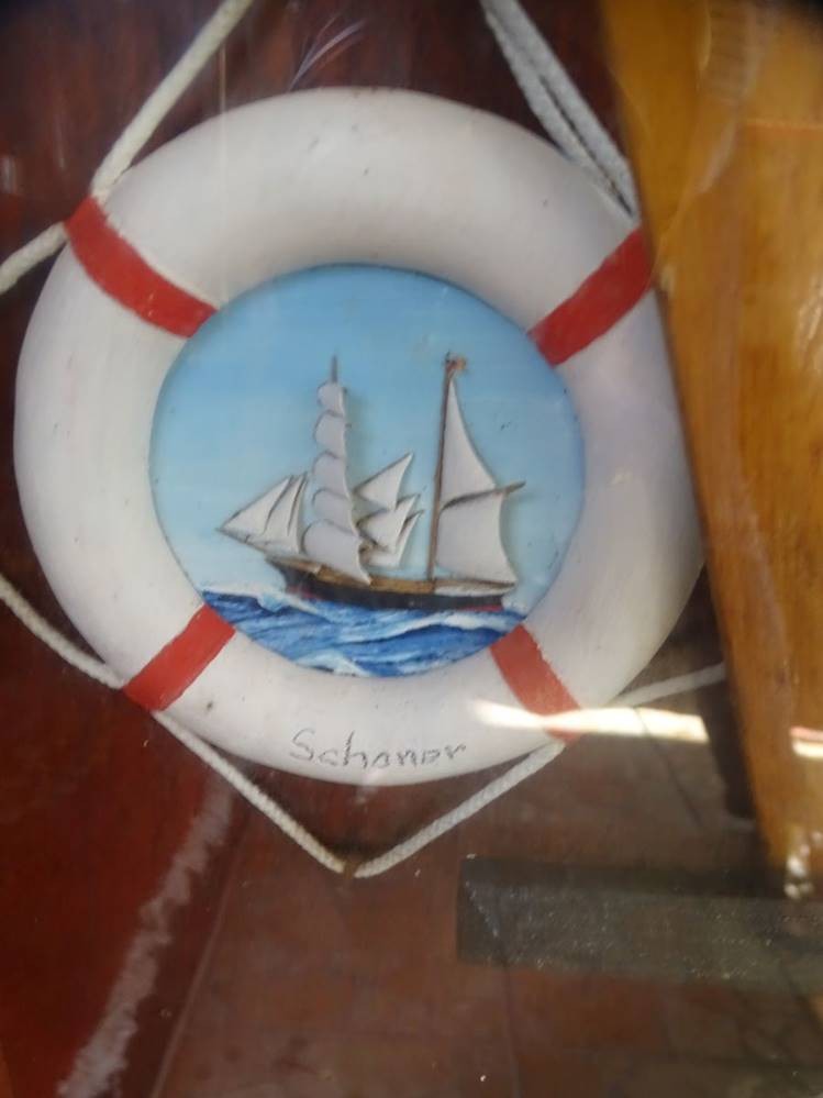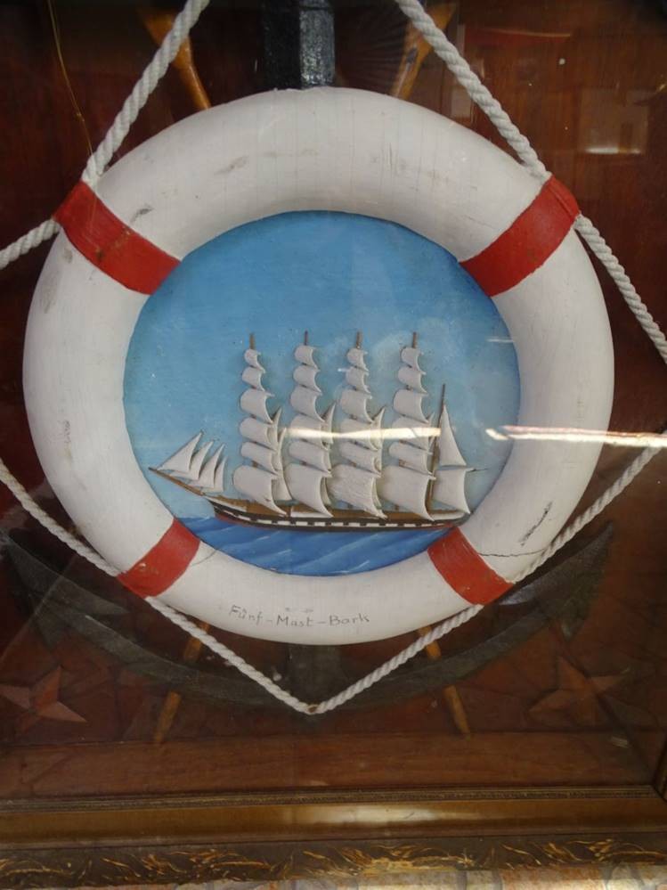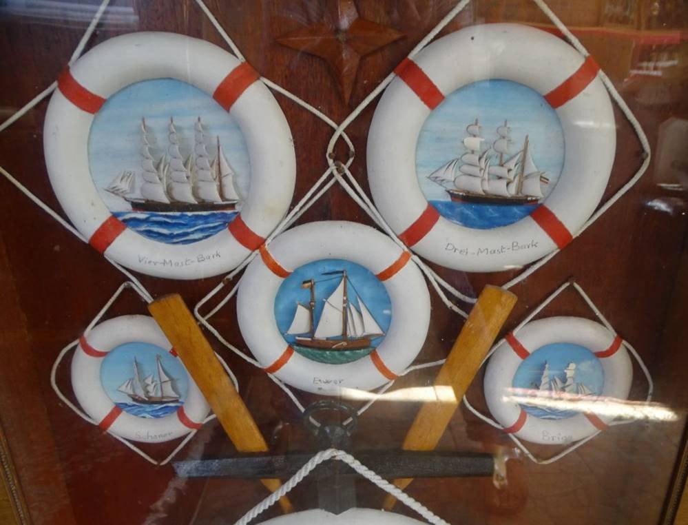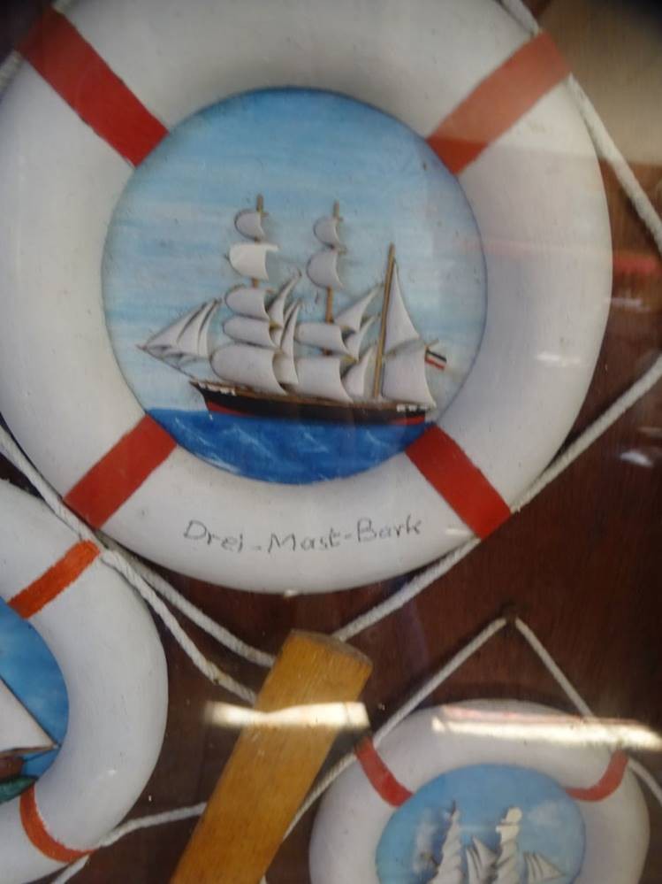 gr. Schaukasten mit Darstellungen verschiedener Segelschiff-Typen in Rettungsringen, hinter Glas, RG 100x65 cm [1]