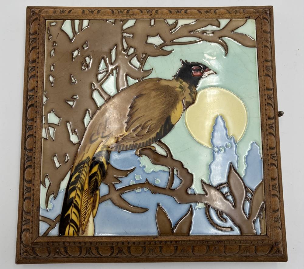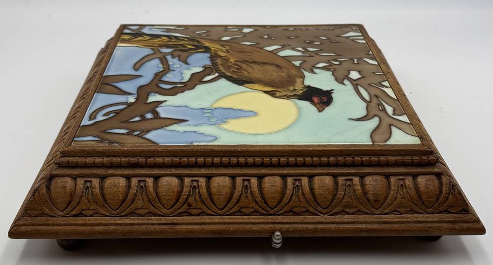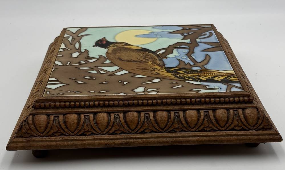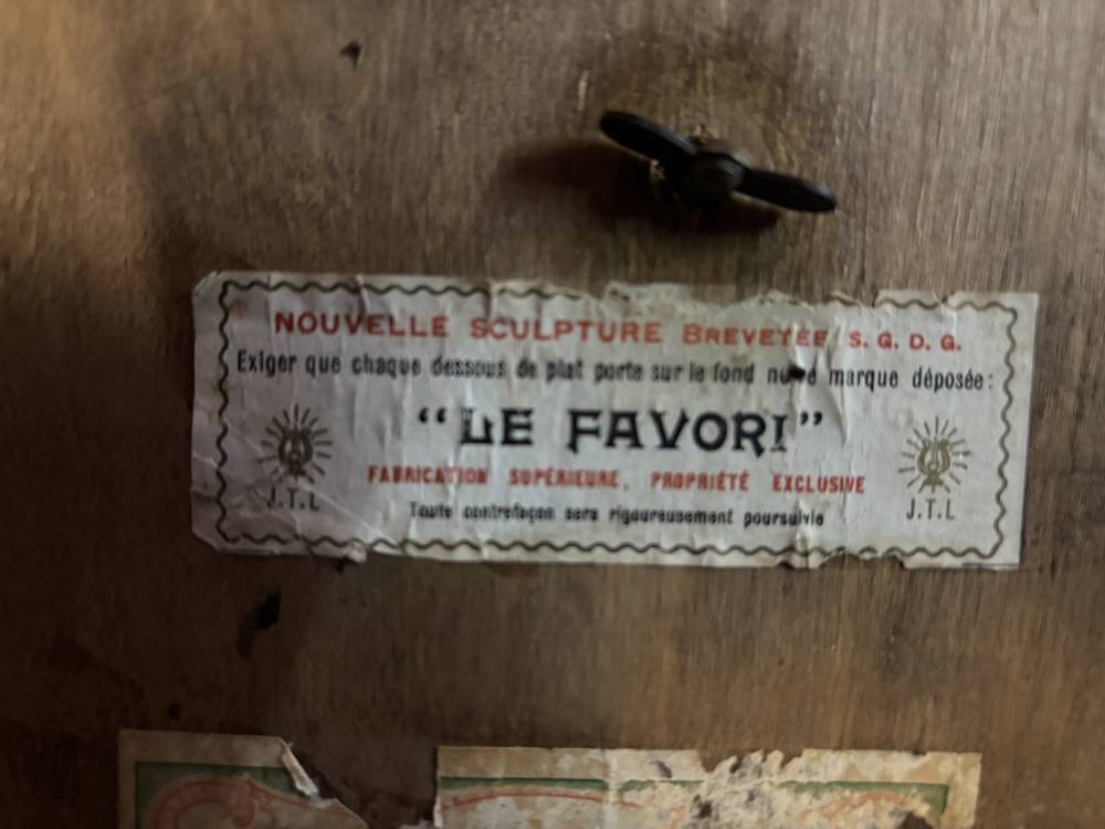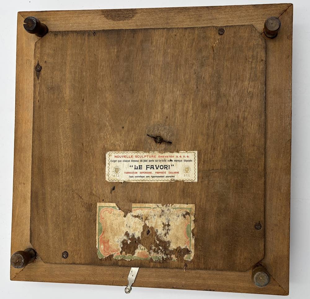 gr. Untersetzer mit Fayence-Platte und Spieluhr, bemalt, Werk läuft, frz. beschriftet "Le Favori", 27x27 cm, H-5 cm, sehr guter Zustand [1]