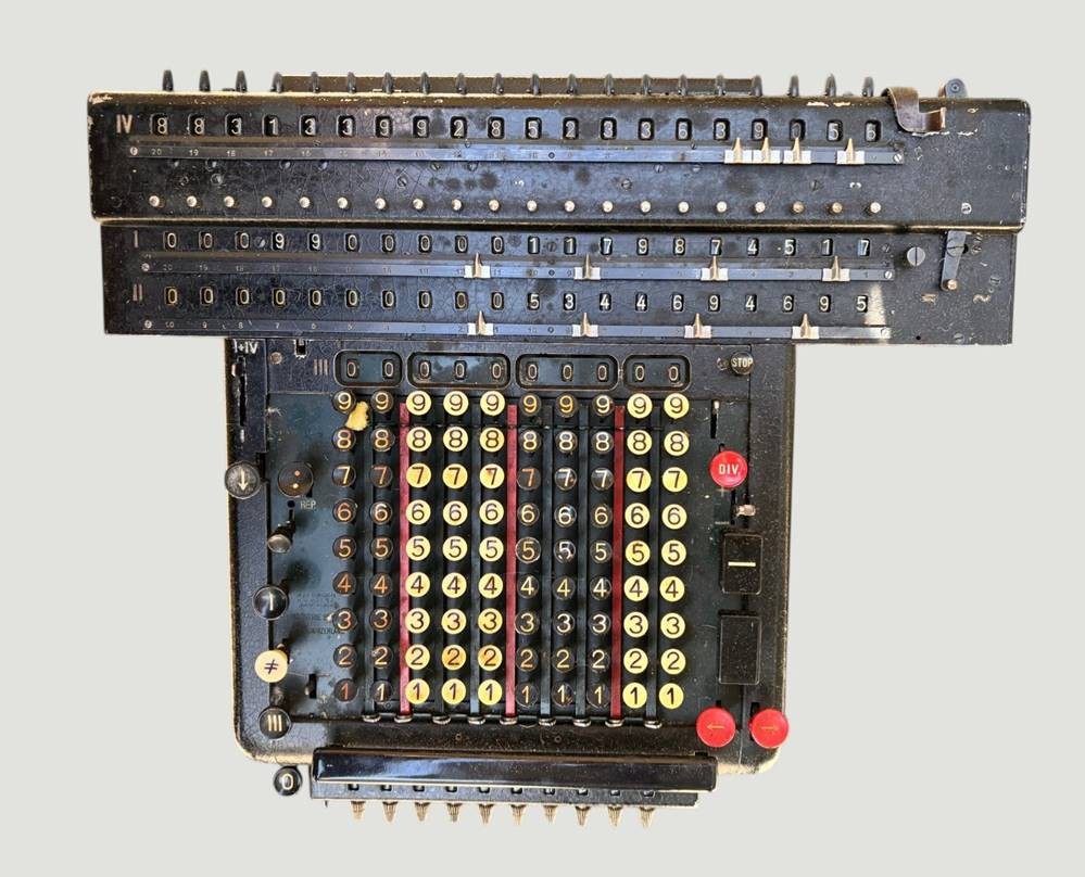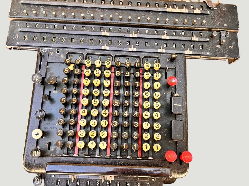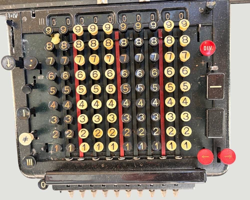 grosse MADAS 20 AT Rechenmaschine., elektromechanisch um 1910, sammelwürdige Erhaltung, Funktion nicht geprüft (kein Kabel), Staffelwalzenmaschine, Das Modell 20A gilt als "Superautomat", da es komplexe Operationen wie Division und Multiplikation automatisch durchführen kann. ca. 16 kg. schwer