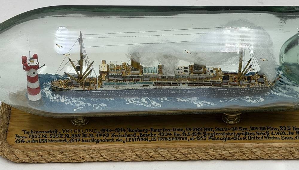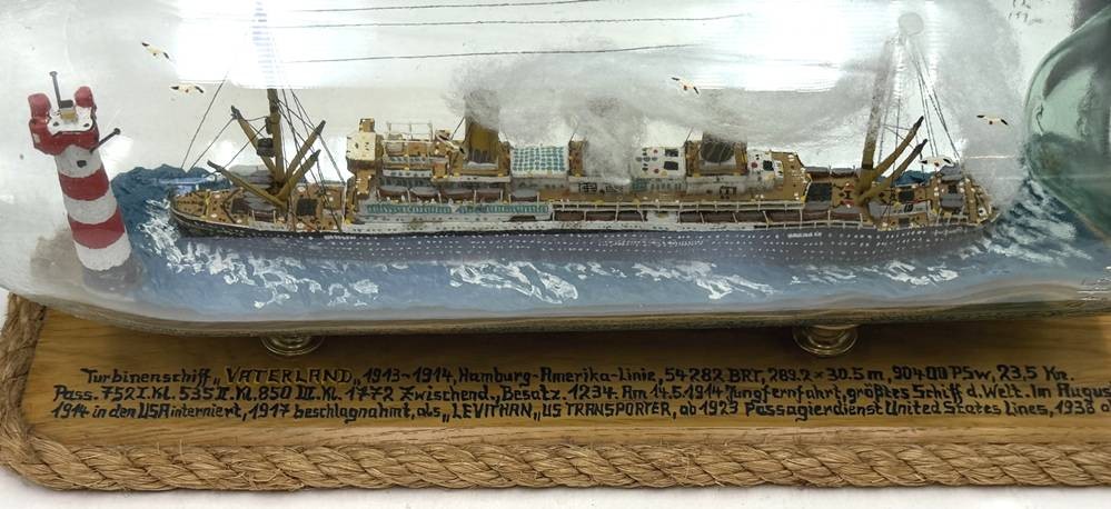 grosses Buddelschiff "Turbinenschiff Vaterland" mit Beschreibung auf Sockel, L-50 cm