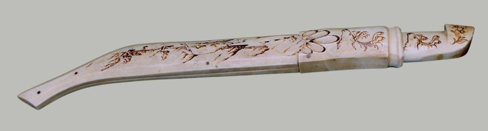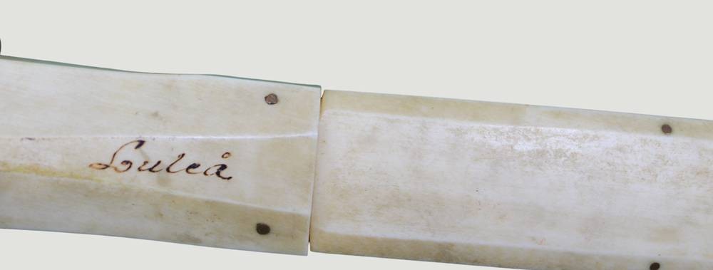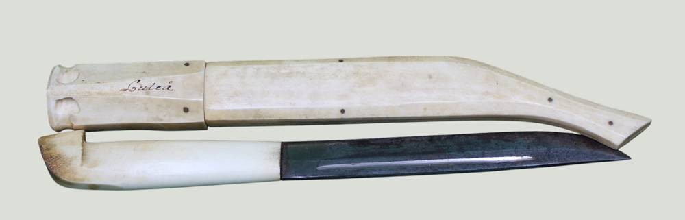 grosses Sami Messer, Nordschweden um 1950, Knochen mit Gravur, L-mit Scheide 31 cm, verso bezeichnet Lulea (Ort kurz vorm Polarkreis) [1]