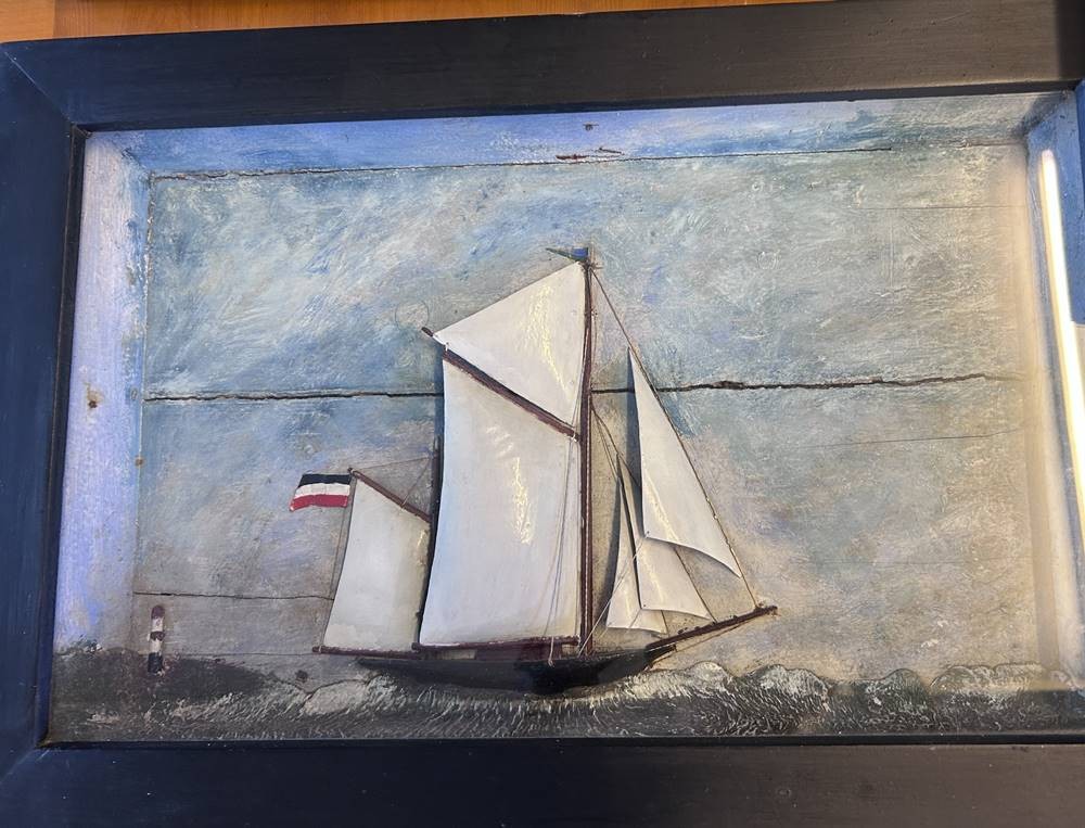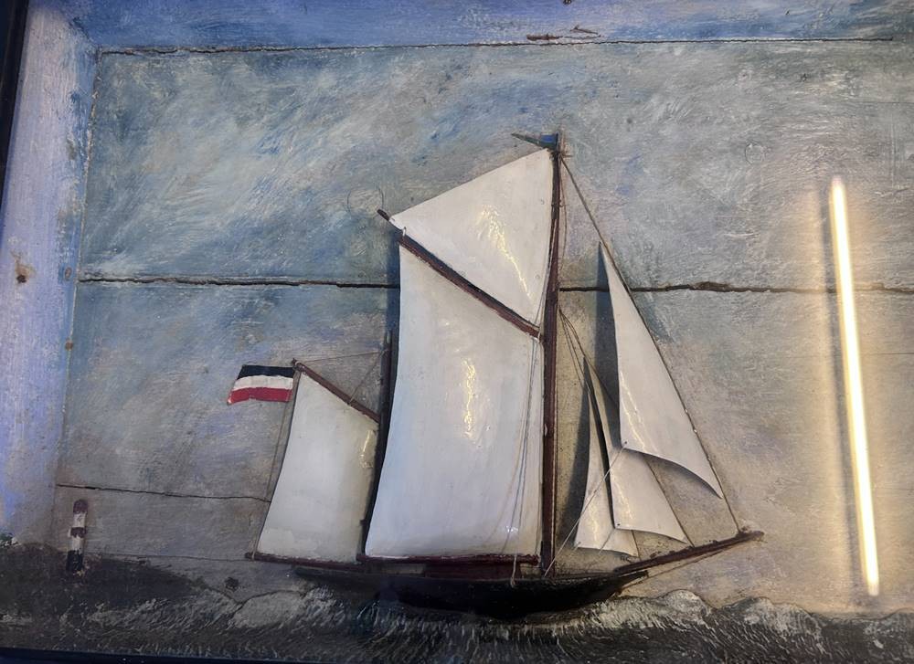 Halbmodell eines Segelbootes in Schaukasten, Deutsches Reich Fahne, H-38 cm, 57x11 cm [1]