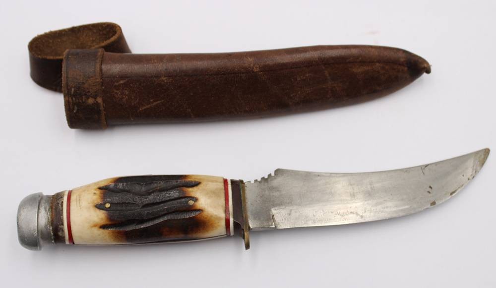 Jagdmesser, älter, Geweihgriffschalen, Lederscheide, ca. L-24cm
