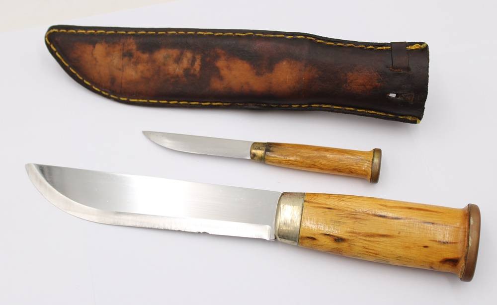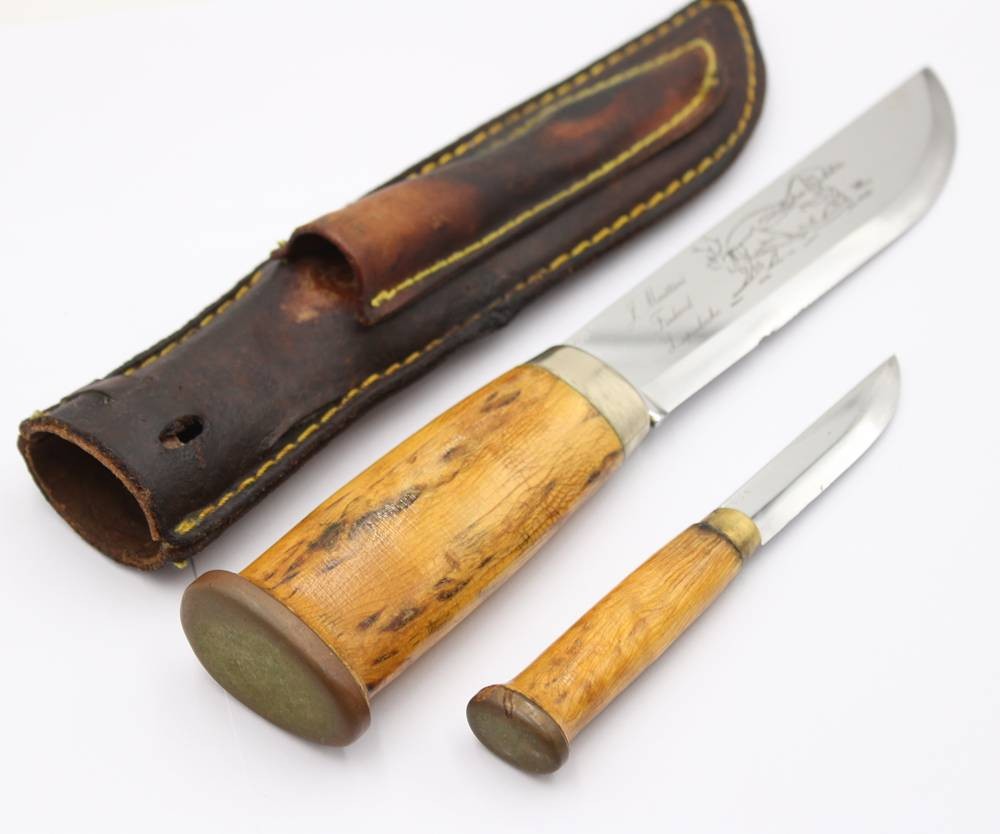Jagdmesser mit Beimesser, J. Marttiini, Lapinleuku, Finnland, Klinge etwas beschädigt, ca. L-31cm