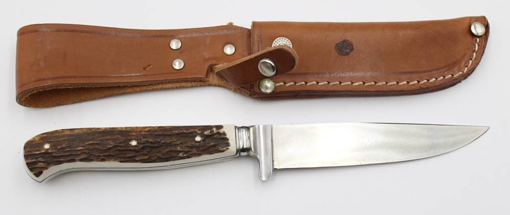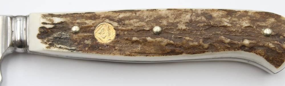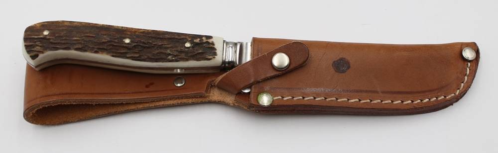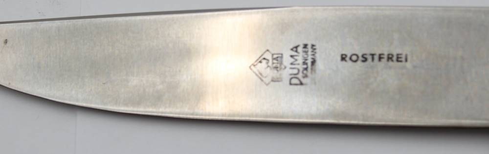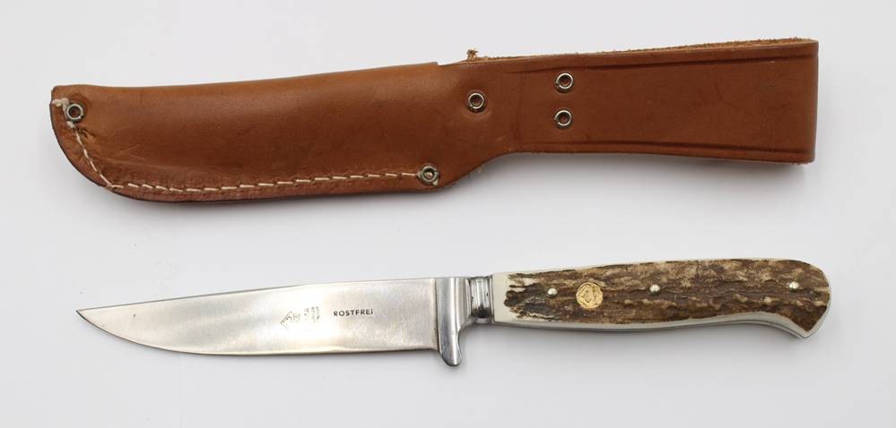 Jagdmesser, Puma, Geweihgriffschalen, Lederscheide, ca. L-22,5cm