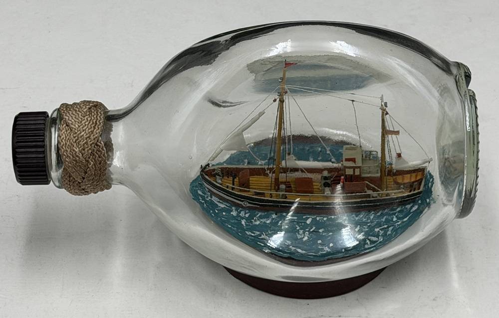 kl. Buddelschiff, Fischkutter, in Whiskyflasche, 21x13 cm [1]