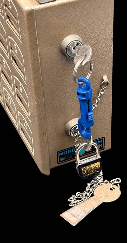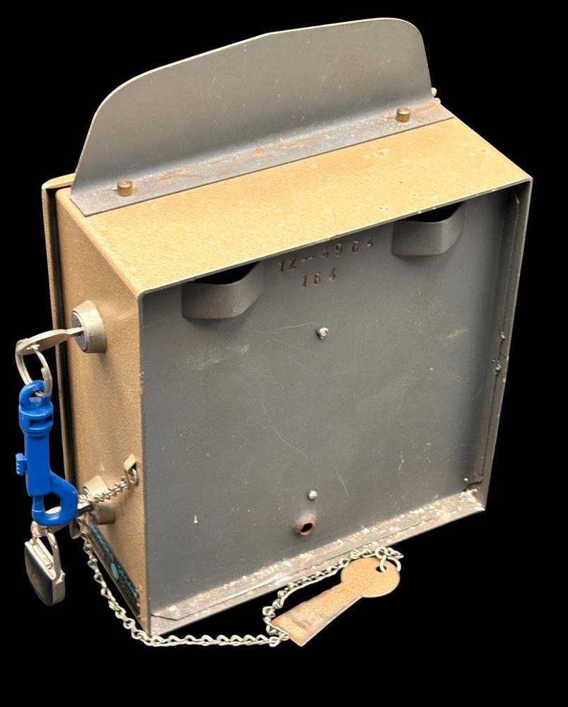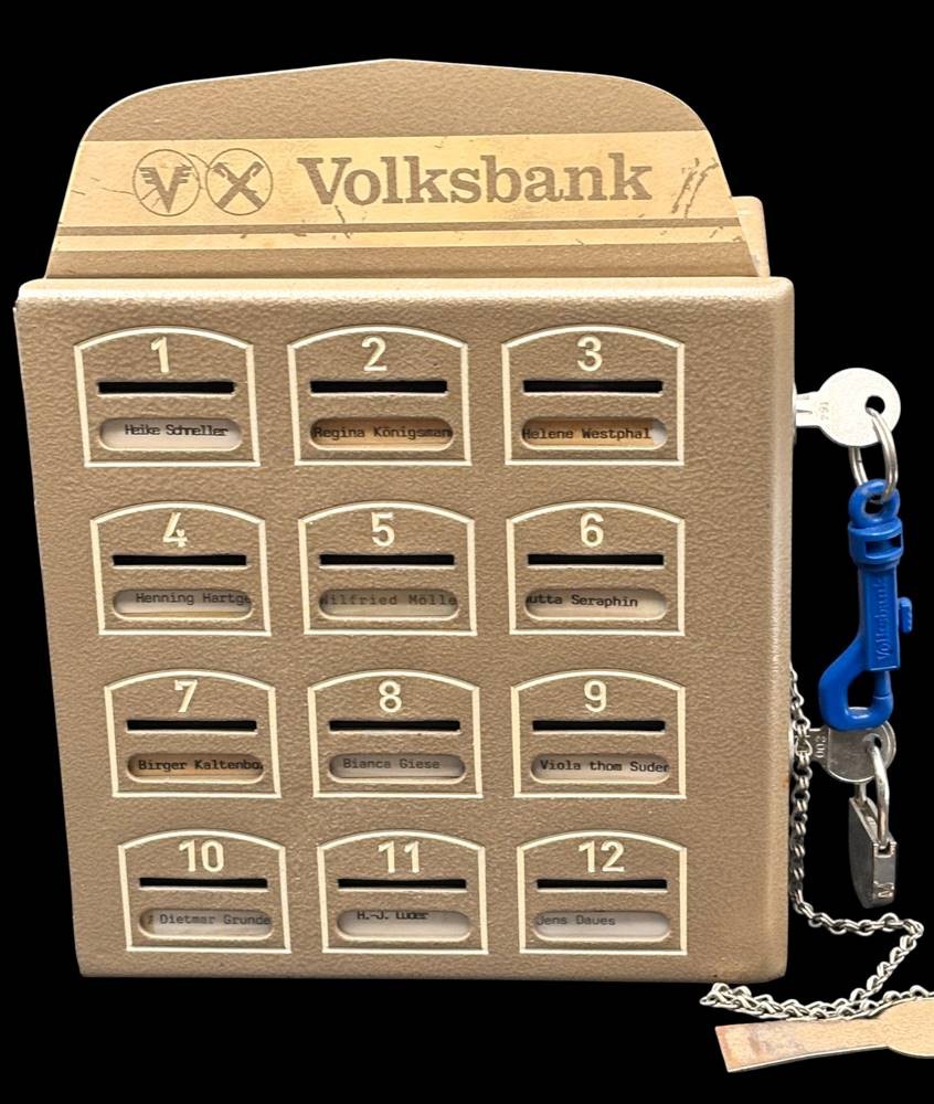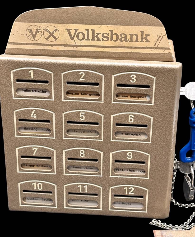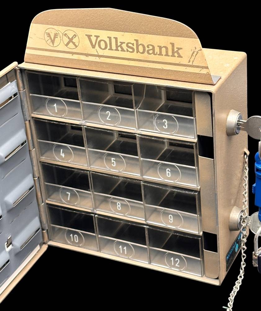 kl. Stahl-Sparklub-Schrank, Volksbank, mit Schlüssel, guter Zustand, H-25 cm, B-19 cm [1]
