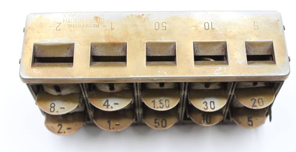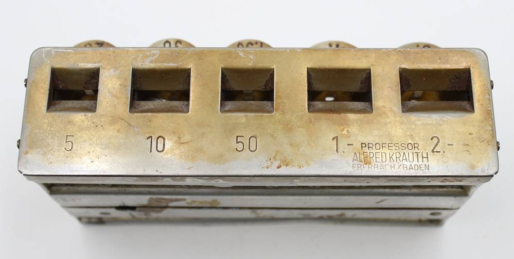 Kleingeldbehälter für Schaffnertasche, Prof. A. Krauth, älter, ca. 9,5 x 18,5cm