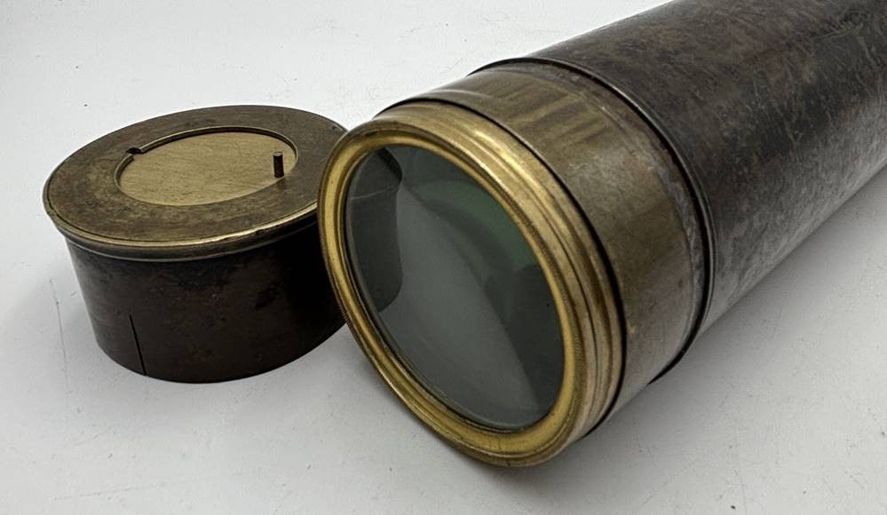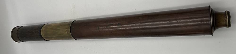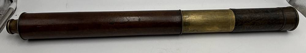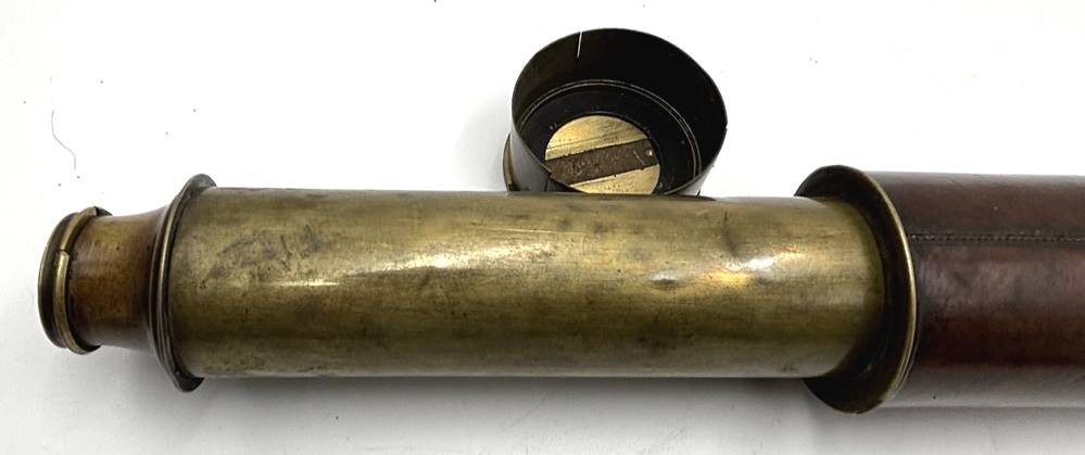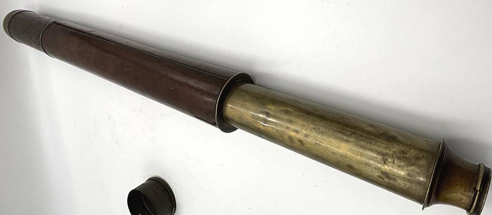 langes Messing-Fernrohr, Lederumhüllt, ausziehbar, L-max 86 cm, vorne mit Schutzkappe [1]
